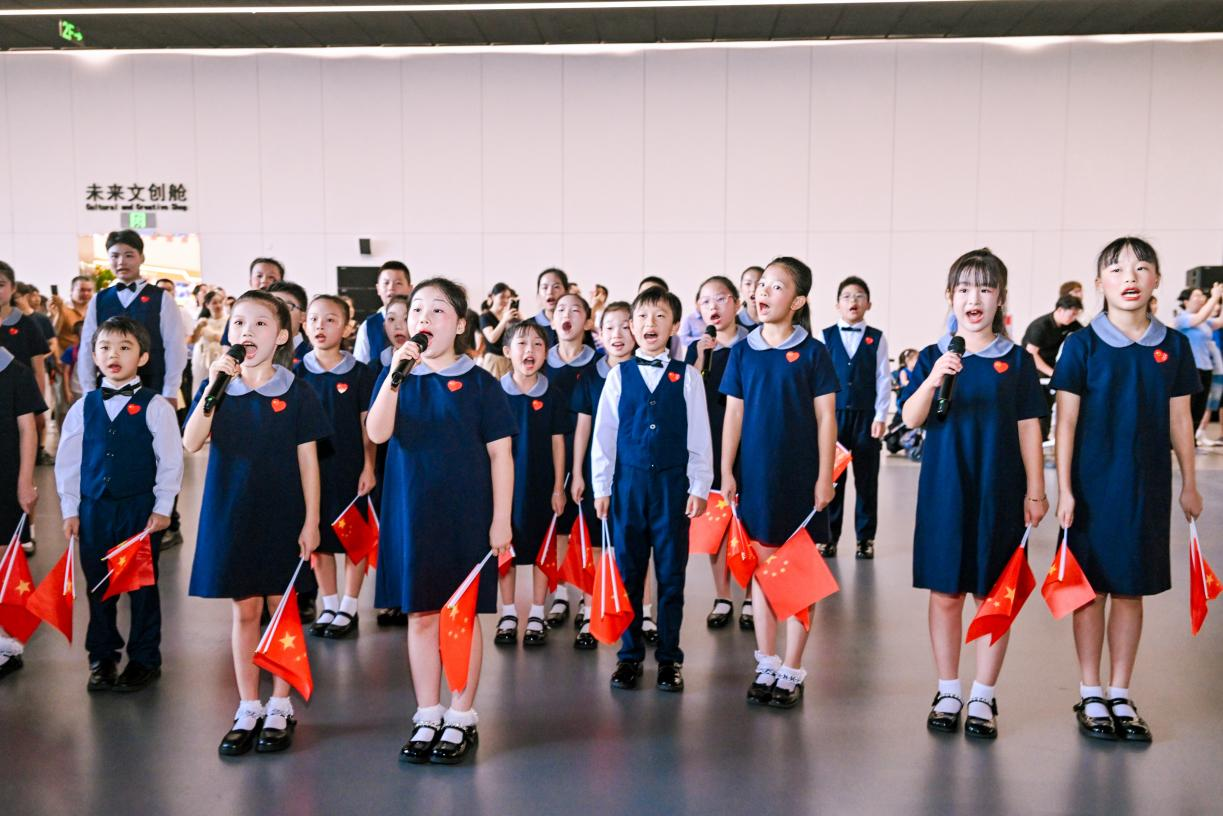10月1日,深圳科学技术馆内,一场“歌唱祖国”千人合唱奏响爱国强音。20架无人机编队点亮现场,深圳交响乐团童声合唱团手持小国旗开唱,千名观众自发举旗和声,科技与歌声交织,成为深圳向祖国致敬的生动场景。