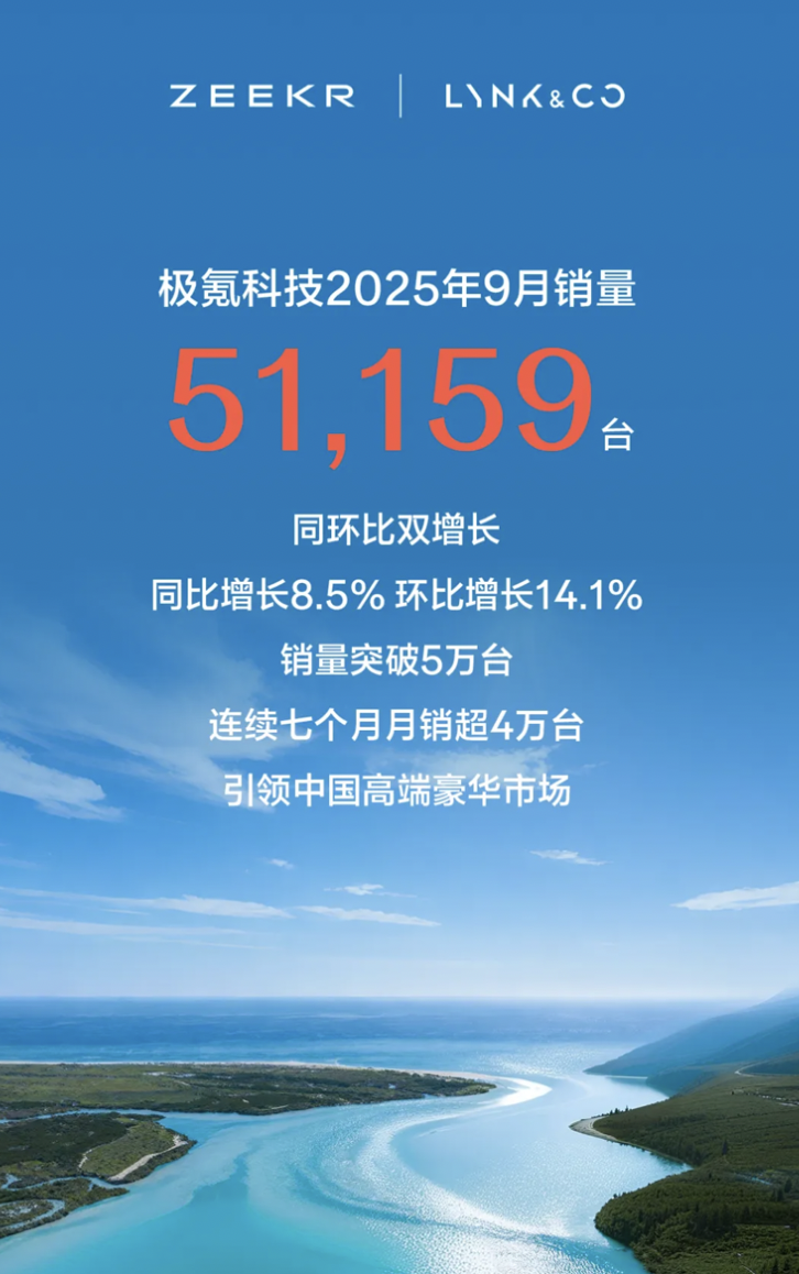 极氪科技2025年9月销量为51159台,同比增长8.5%,环比增长14.1%。这意味着,极氪科技已实现连续7个月月销量超过4万台,9月销量实现同环比双增长,并且创下了2025年单月销量新高。定位为“全球超豪华旗舰SUV”的极氪9X于9月29日上市,上市后13分钟,大定突破10000台。根据极氪9X上市发布会后的媒体群访,吉利汽车集团高级副总裁、极氪科技副总裁林杰透露,在极氪8月公布下半年产品更新计划后,连续两个月极氪001销量实现同比增长。