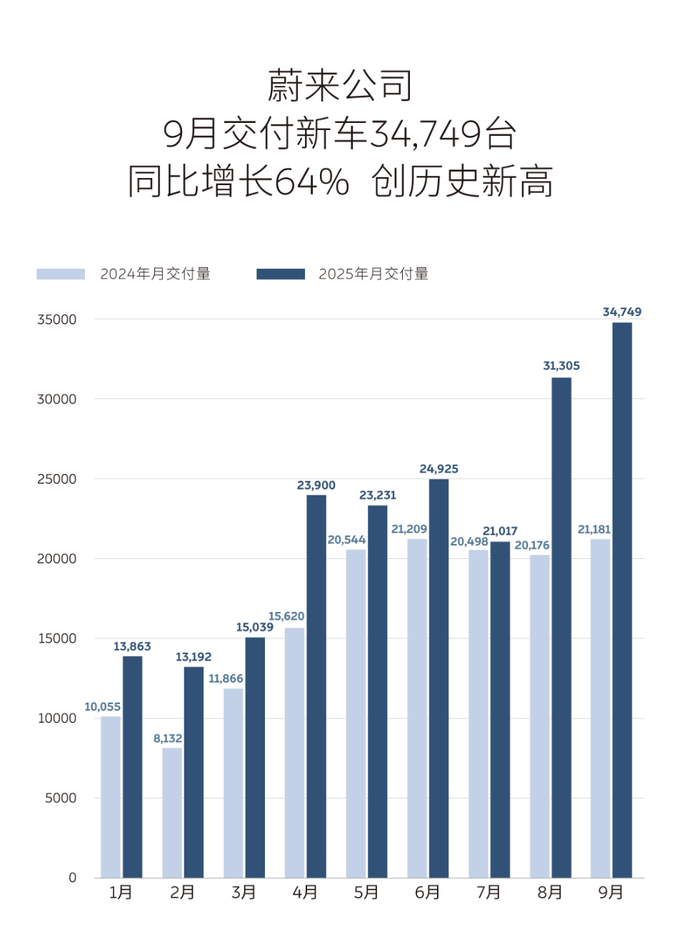 2025年9月,蔚来公司交付新车34749台,同比增长64%,创下月交付量历史新高。其中,蔚来品牌交付新车13728台,乐道品牌交付新车15246台,firefly萤火虫品牌交付新车5775台。截至目前,蔚来公司已累计交付新车872785台。9月,蔚来全场景科技旗舰SUV全新ES8正式上市,并同步开启全国交付。