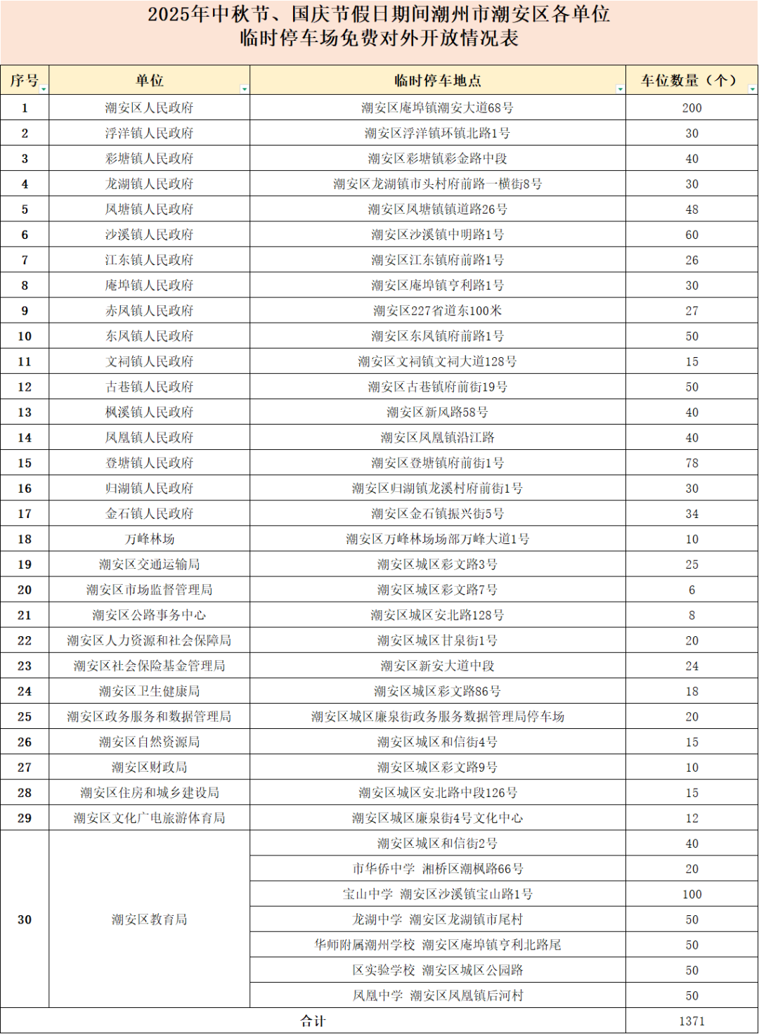 国庆中秋长假,潮州市机关事业单位为广大市民游客提供了多个临时停车位,以减轻节假日期间停车压力。