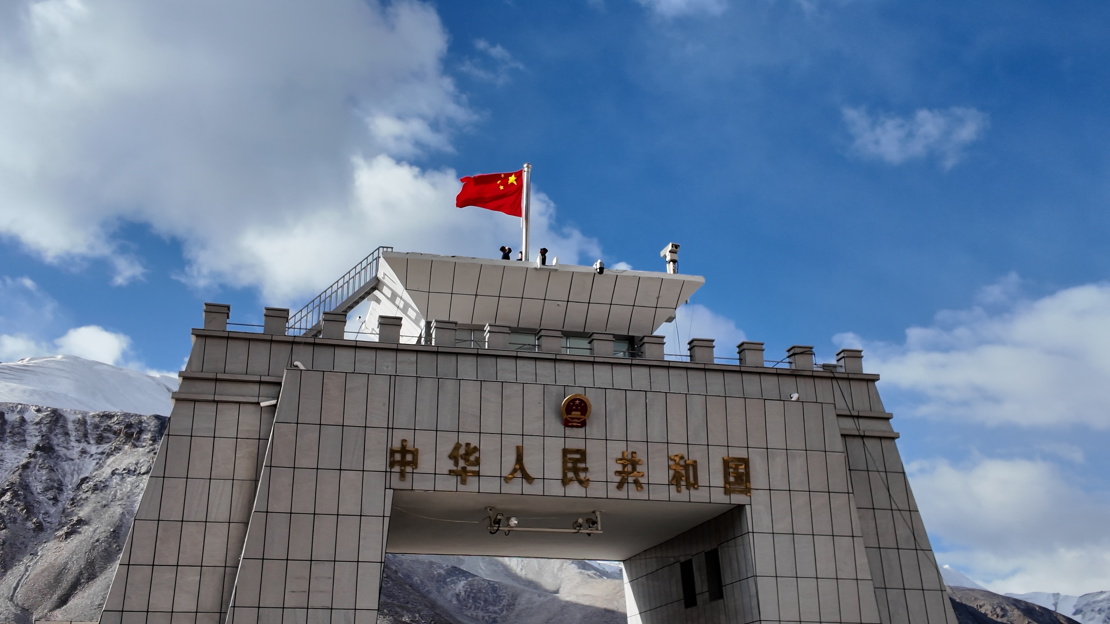 10:30,随着金色的阳光洒满帕米尔高原,海拔5100米的红其拉甫国门,在响彻广场的国歌声中,巍峨雪山映衬下的五星红旗缓缓上升,迎风飘扬在世界上海拔最高的国门之上。
