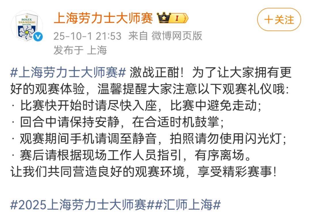 10月1日晚,上海劳力士大师赛官方账号发布提醒,注意以下观赛礼仪: