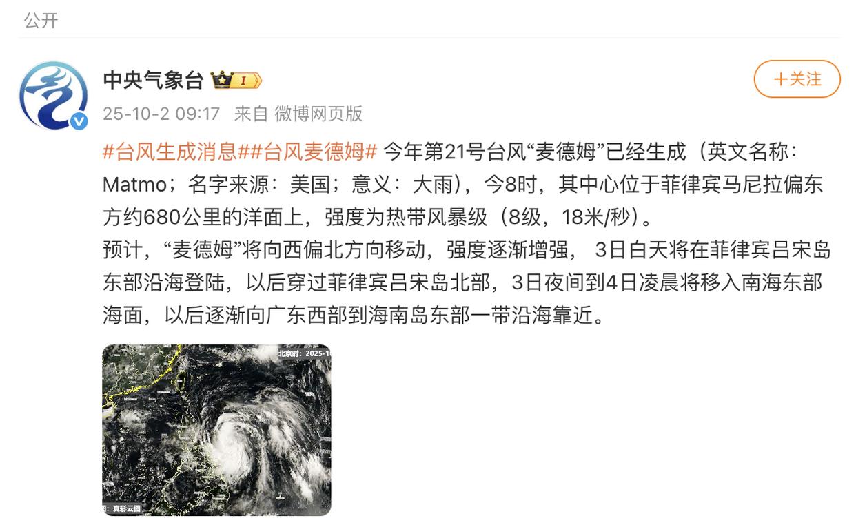 据@中央气象台 消息,今年第21号台风“麦德姆”已经生成。