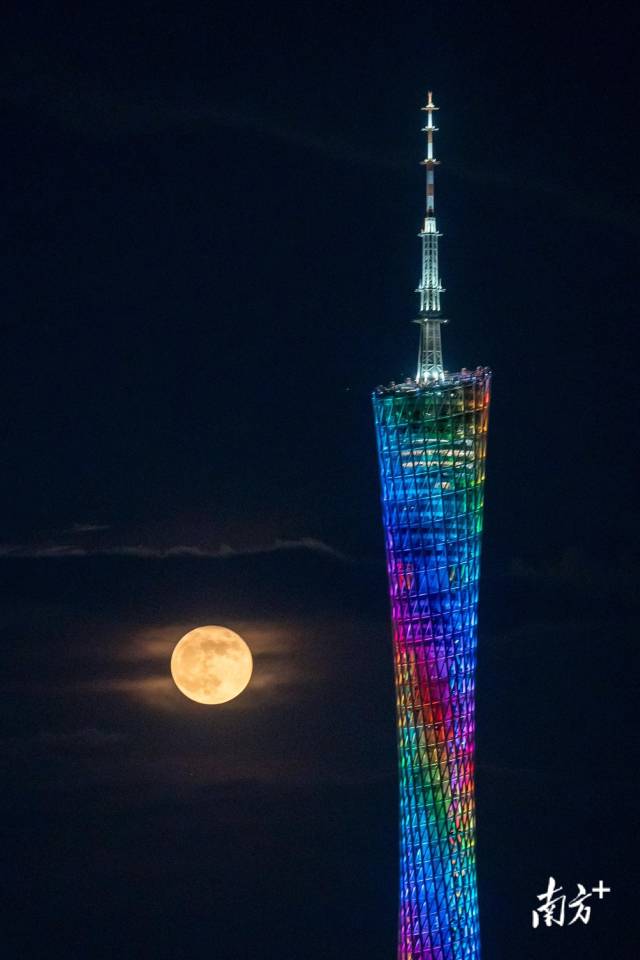 2024年9月18日晚,一轮圆月缓缓升起。从海印桥看去,月亮和广州塔构成一幅美丽的画卷。南方+记者 张令 钟志辉 摄