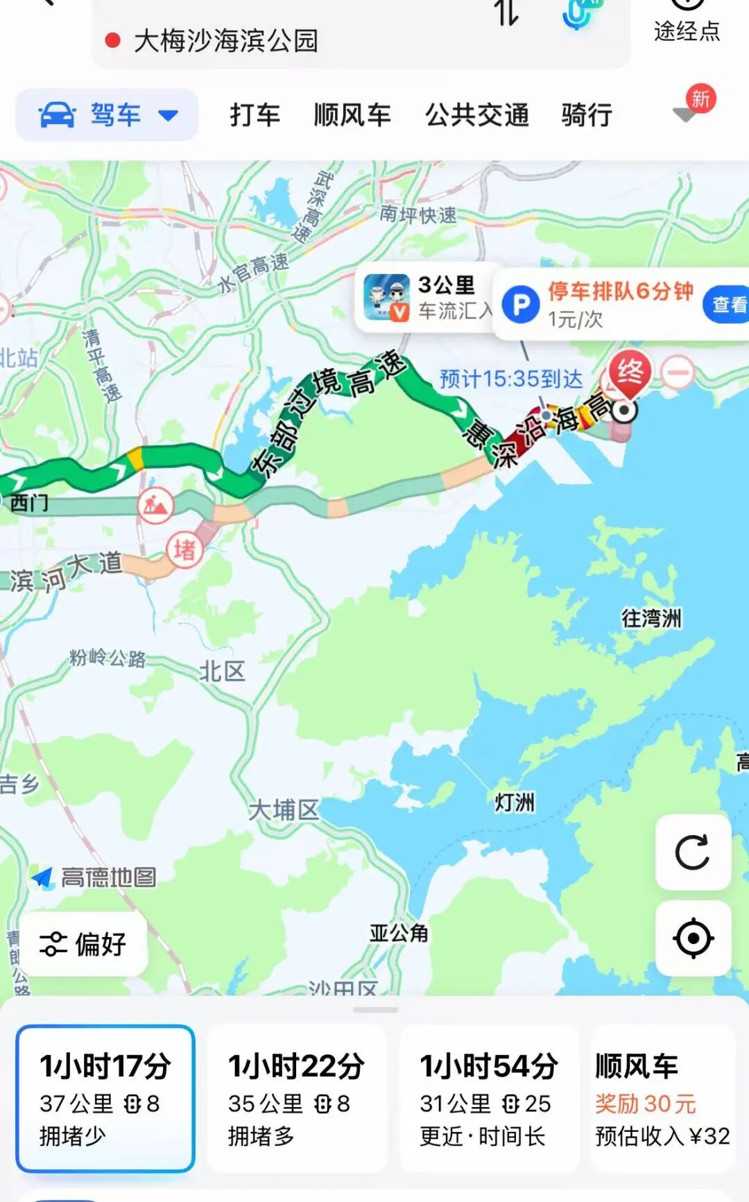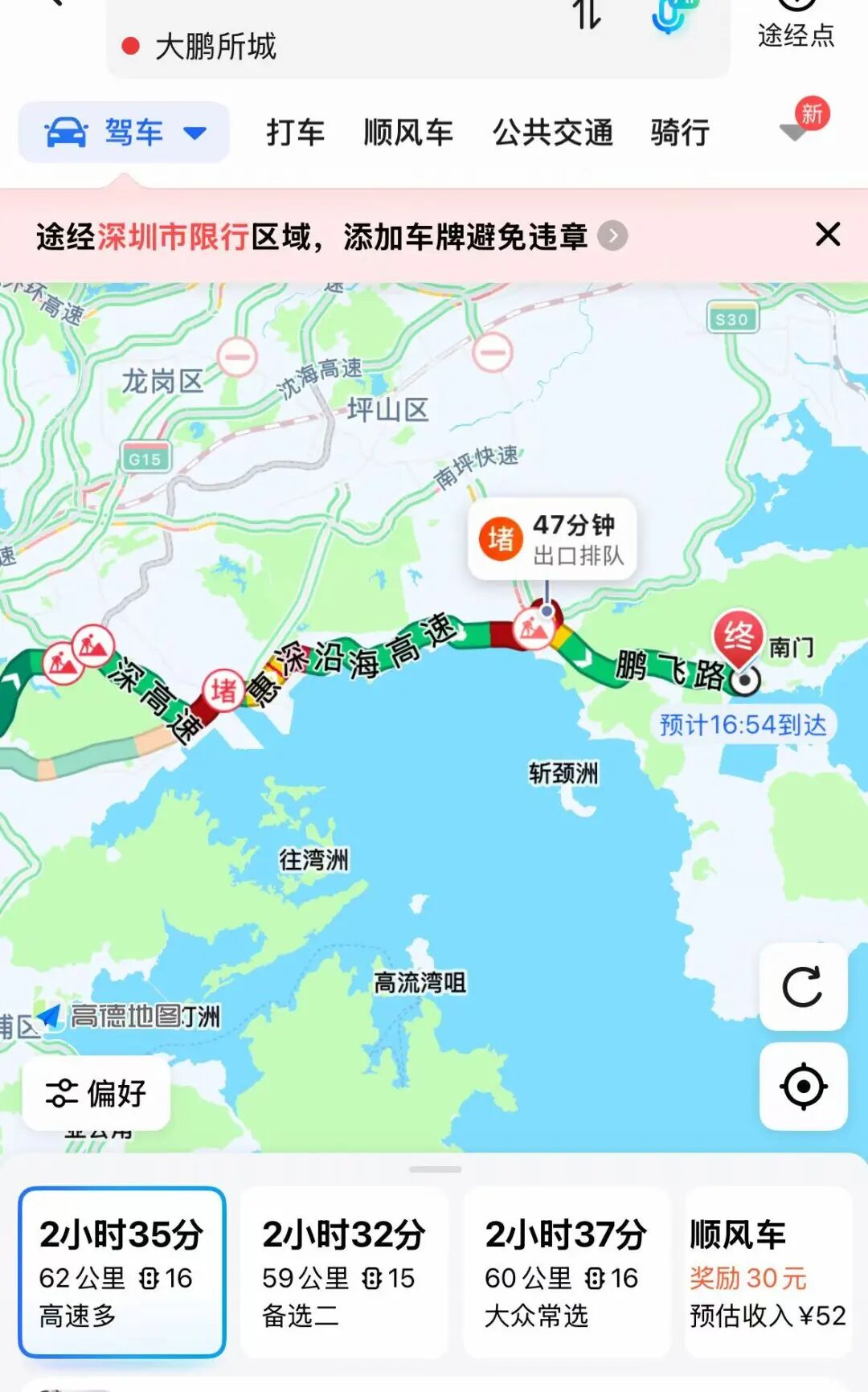 同时在地图上看到,目前去往大小梅沙和大鹏方向是有堵车的情况,有计划前往的市民请提前规划好路线并预约。