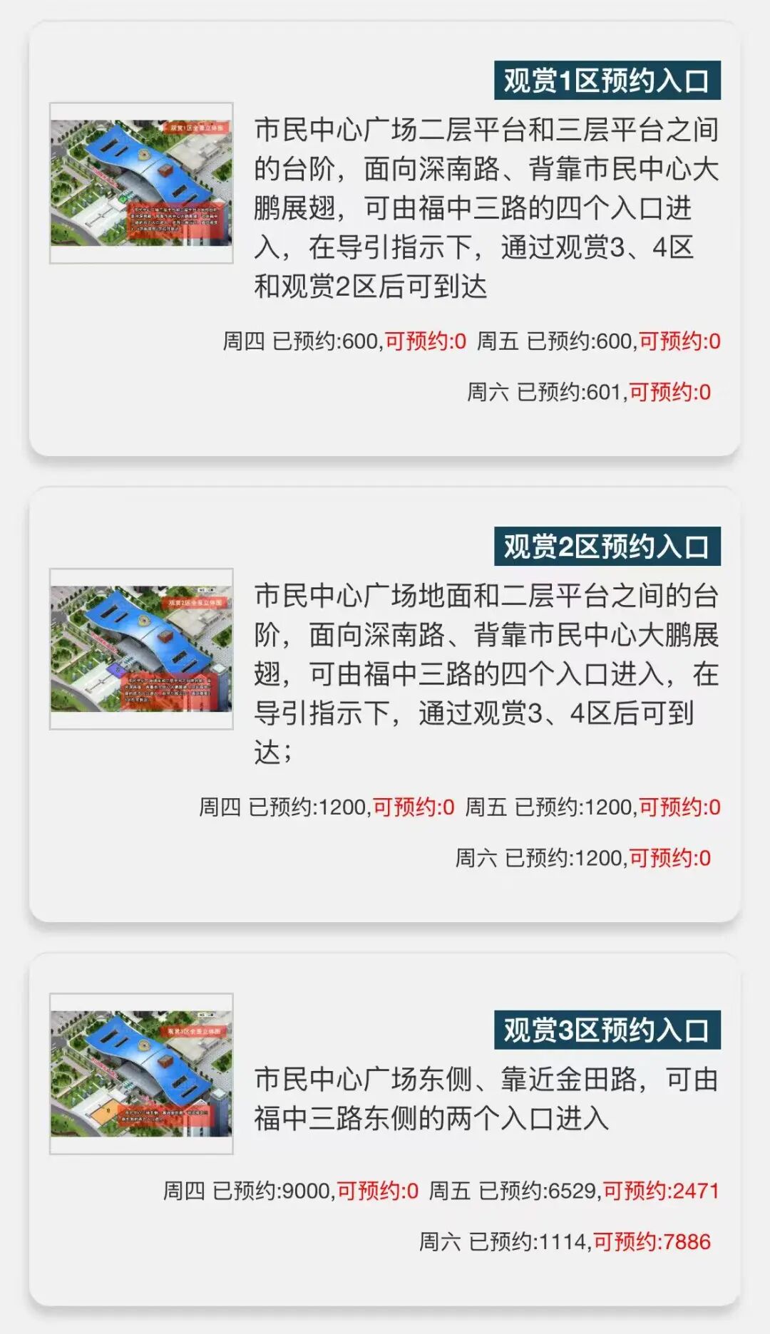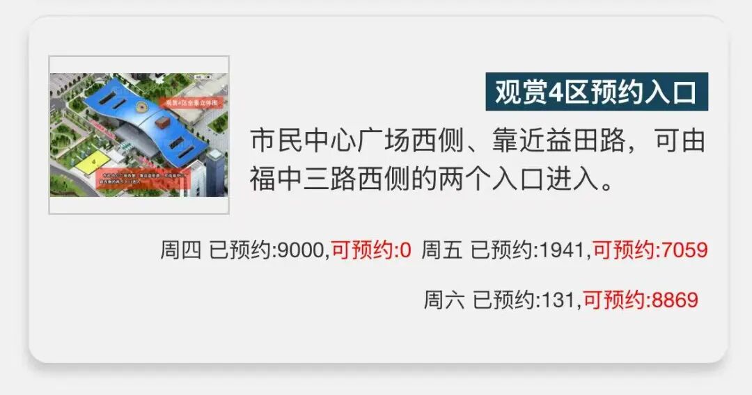 在“福田中心区夜景灯光预约引导服务”小程序可以看到,截至今天(10月2日)13:00,深圳市民中心灯光秀观赏1区、2区均已约满。