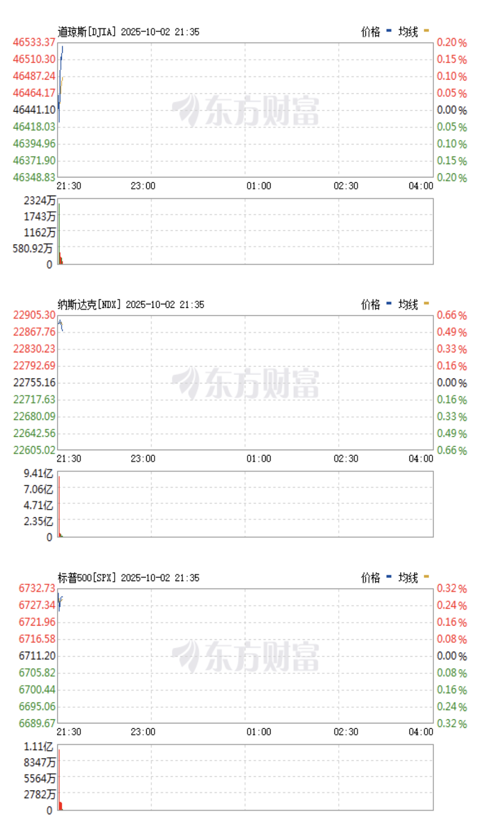 美东时间10月2日,美股三大指数开盘涨跌互现。道琼斯指数跌0.04%,标普500指数涨0.22%,纳斯达克综合指数涨0.59%。