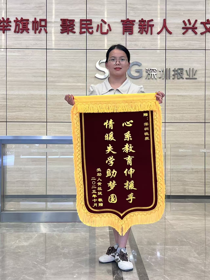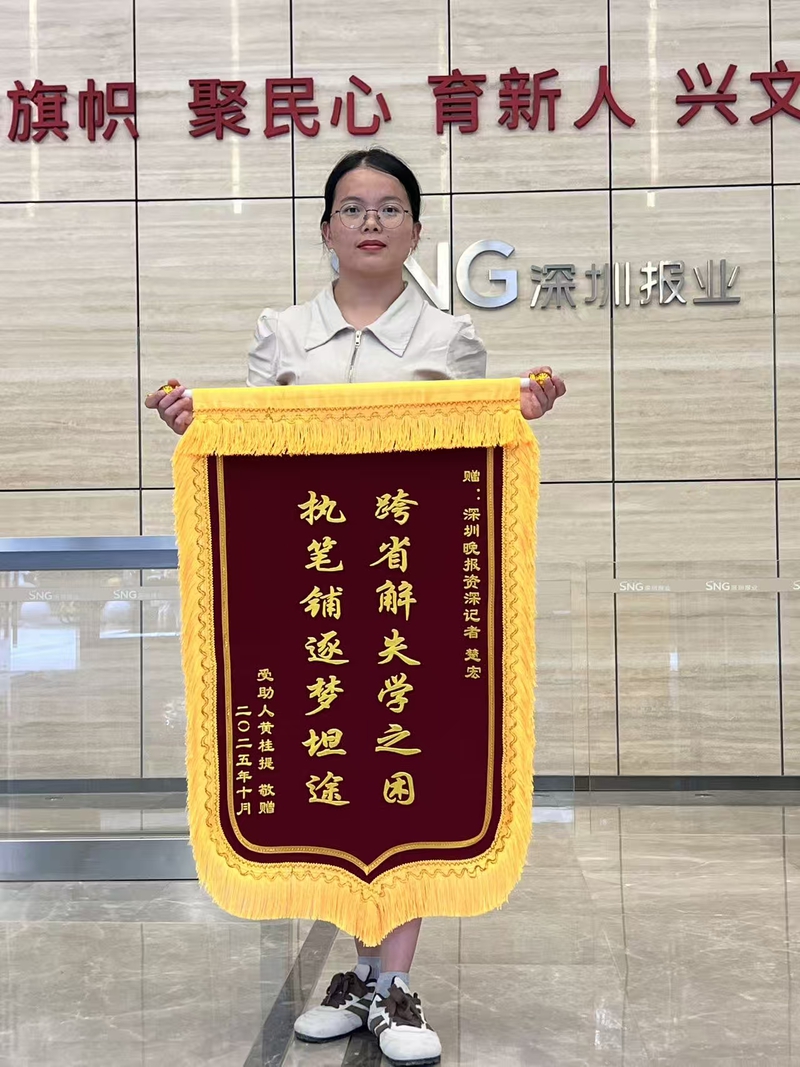 10月2日,一位年轻女孩手捧两面锦旗,走进深圳报业集团新媒体大厦大堂。