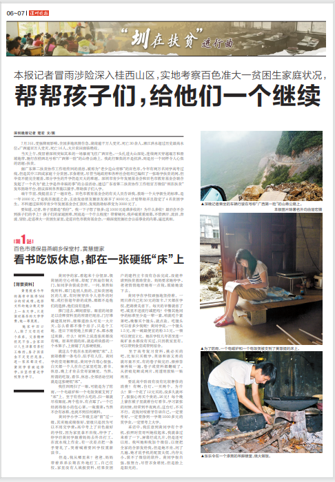 深圳晚报不仅向市民发出倡议,还派出记者专程赴广西采访了多位贫困学子。2017年7月17日,深圳晚报以四个整版推出“圳在扶贫进行曲”专题报道,其中第一站采访的便是黄桂提。