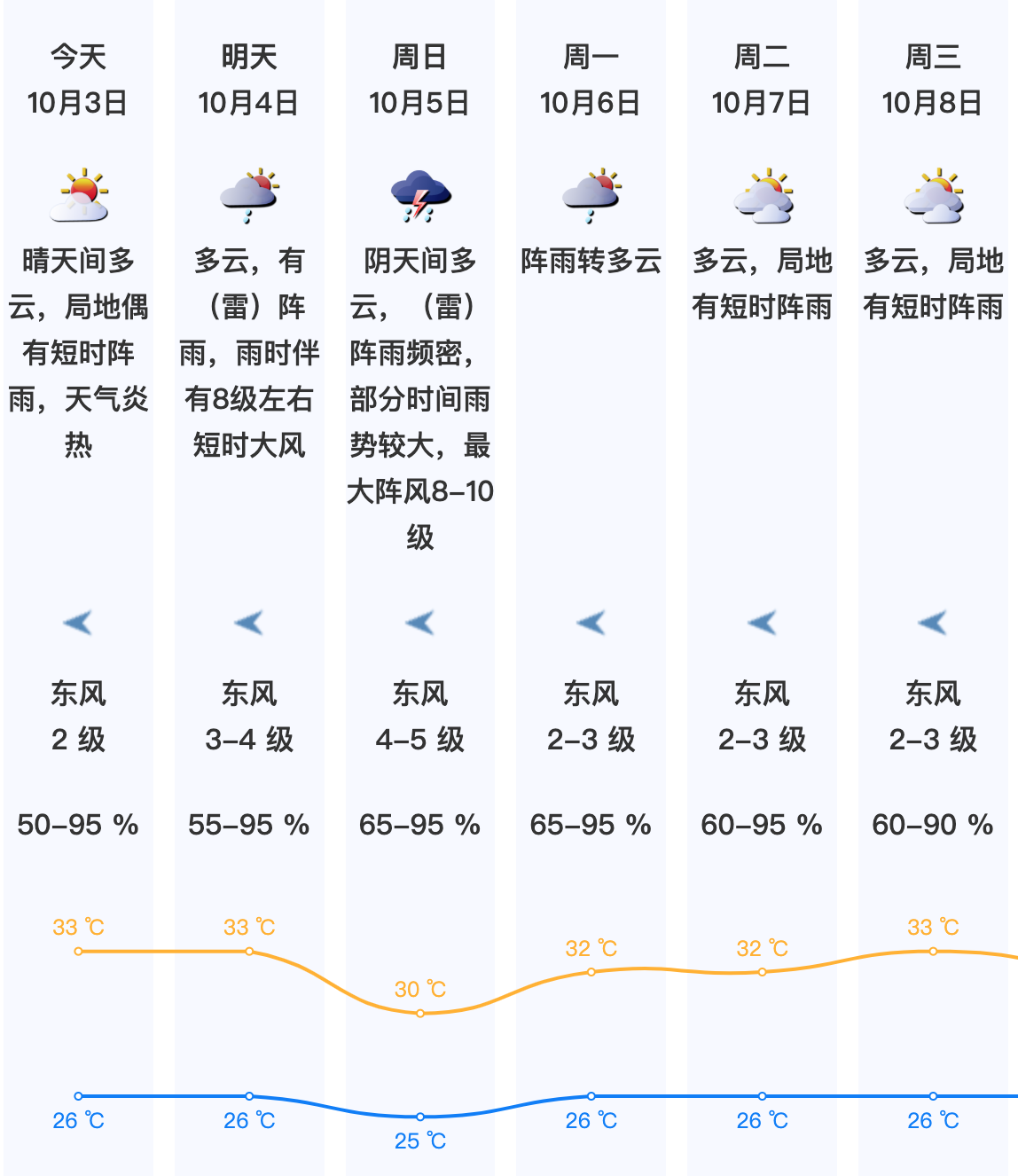 4日夜间到5日受台风环流影响,阵雨频密,局地有暴雨,东到东南风最大阵风陆地6-7级,沿海高地和海区8-10级。