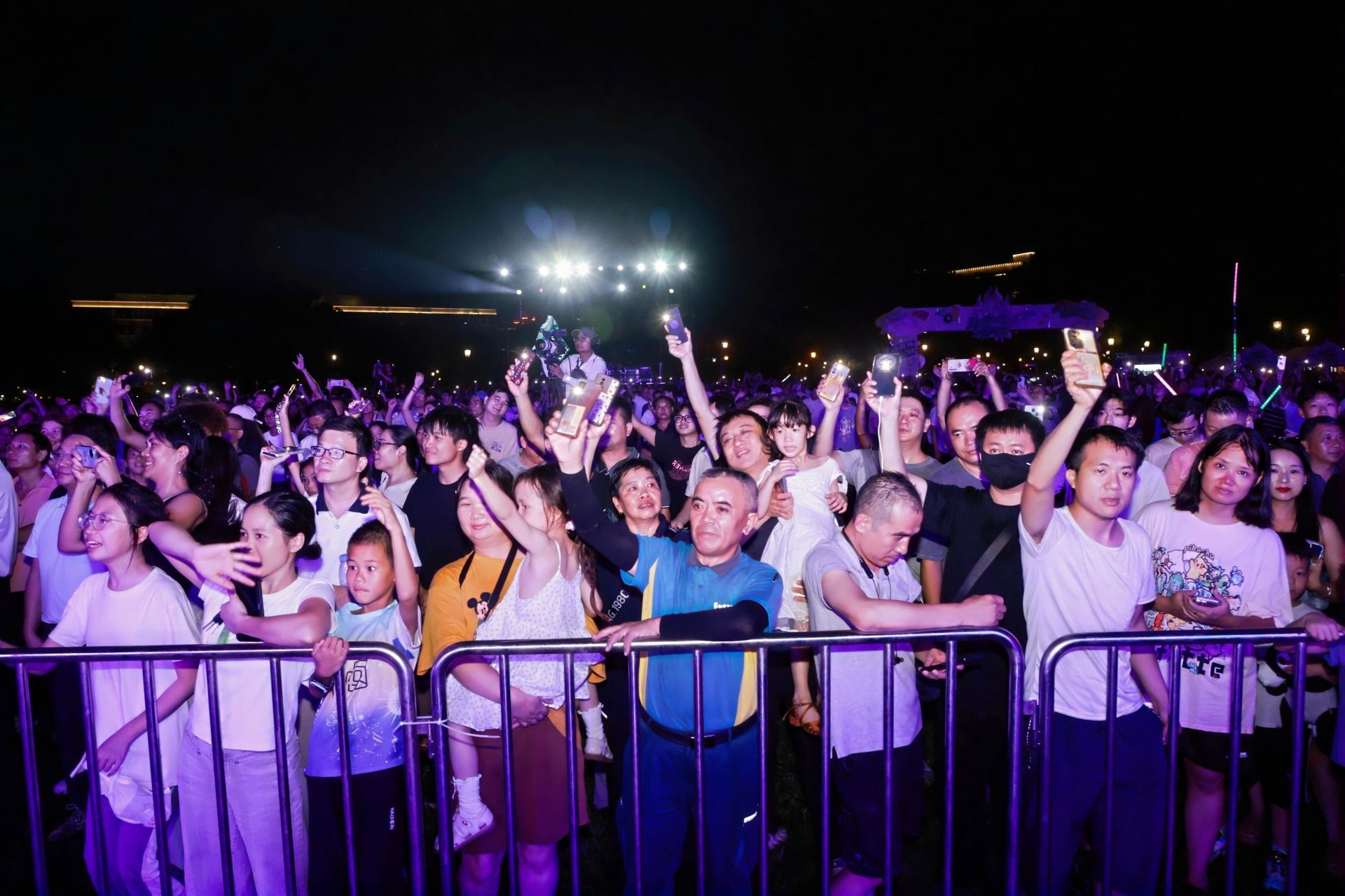 当晚率先上场的是万能留声机、smiling女子乐队、爆青筋BCJ乐队、白平衡乐队。阿库司专业音响的低鸣,带给市民演唱会级的音乐享受。当《月半小夜曲》《破茧》《孤勇者》等熟悉的旋律响起,“开口就会”的金曲电声升级版连续奏响,台下千人齐声跟唱,副歌一响,全场手机灯光瞬间化作星海,“一个人听歌”的场景瞬间变为“万人共欢”!