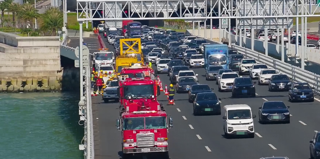10月3日14时09分,深中通道路网调度中心监控员通过事件检测系统,发现一辆粤Q牌小车异常停靠在深圳往中山方向隧道出口处应急车道,车头冒烟,随即窜出明火并快速增大。
