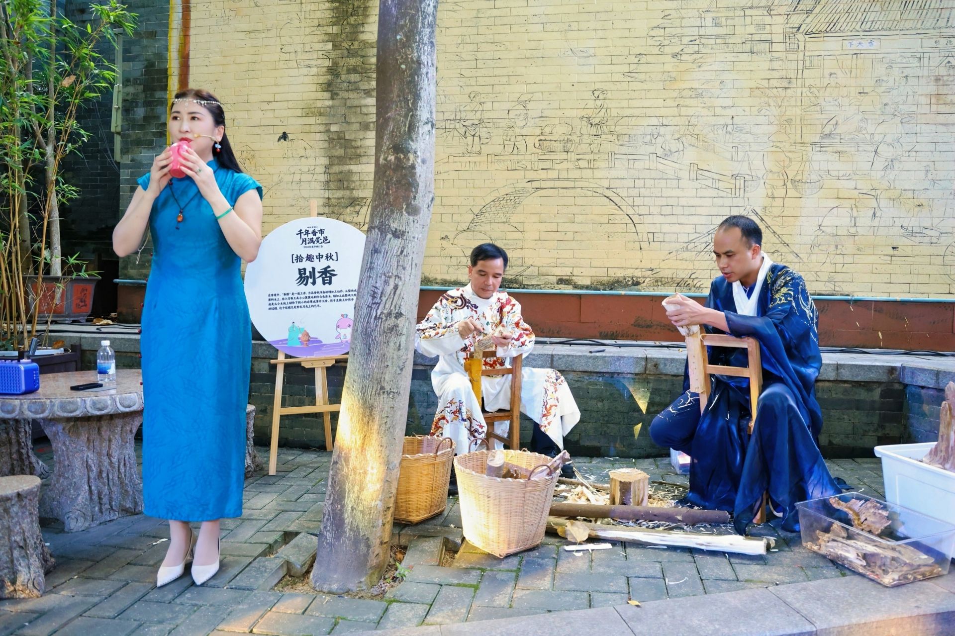本次古风香市灯会以一套完整的香文化仪式拉开序幕,从“点香火”到“逛香街”,每一步均浸润传统韵味。活动伊始,悠扬的古筝乐声勾勒出明清时期牙香街“香商云集”的旧日图景,4位身着传统服饰的少女手托鎏金沉香炉、手提莞香木篮,开展“女儿香挑香巡演”,生动还原“怀香换粉”的经典传说,为仪式预热。