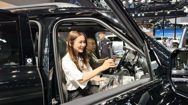 方程豹展区的销售顾问方义龙很快就进入了“战斗状态”。首批观众涌入展台,他立即上前热情接待,细致讲解车型亮点。“这款四驱的钛7非常适合家庭出行以及山地越野,”他一边介绍,一边为观众介绍车辆性能。