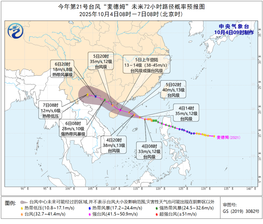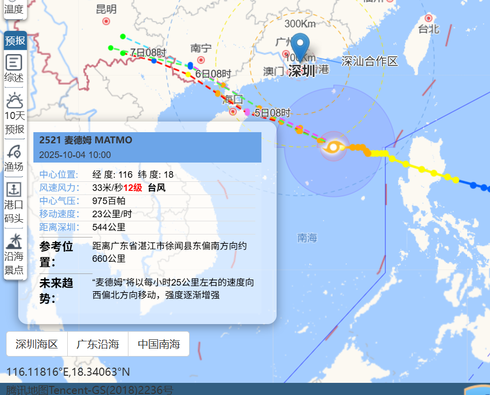 今年第21号台风“麦德姆”将继续趋向粤西到海南岛,4日下午至5日早晨以台风级或强台风级从深圳南部海面掠过,距深圳最近距离约350-400公里。受其影响,深圳市(含深汕)4日夜间至5日阵雨频密,并伴有8-9级最大阵风。深圳市气象台将于2025年10月4日12时00分发布全市台风蓝色预警信号,请注意做好防御。