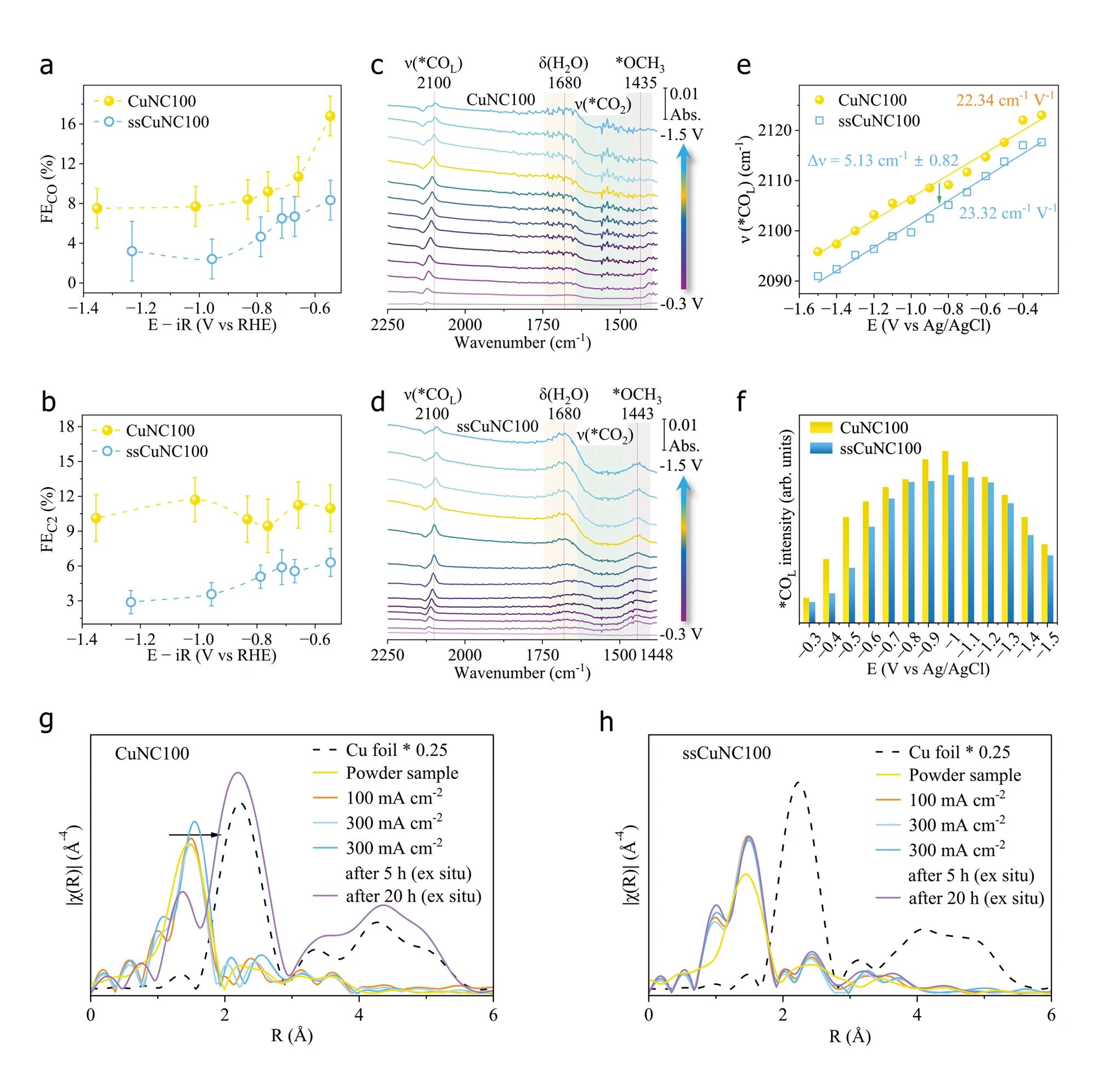 张小龙介绍,首先,优化的原子间距强化了铜原子对关键反应中间体*CO的“抓力”。原位红外光谱显示,催化剂对CO的吸附峰发生蓝移且信号更强,表明两者结合更牢固,这防止了CO过早脱附成为无用的副产物一氧化碳,为后续转化为甲烷赢得了宝贵时间。