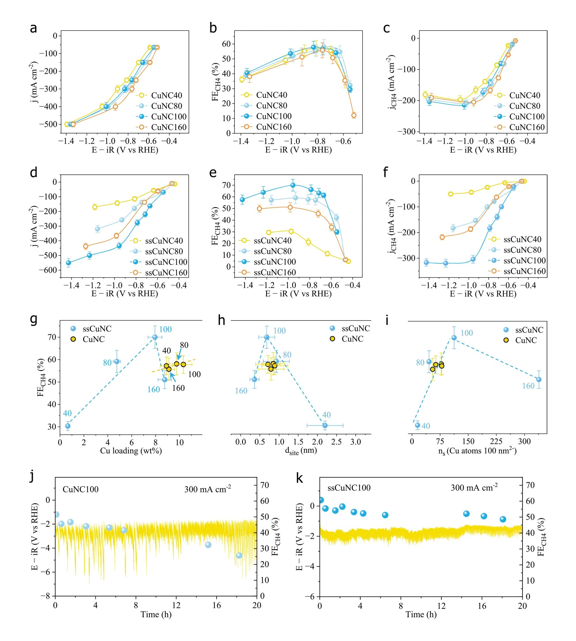 经过如此精密的“原子排阵”,新型催化剂(ssCuNC)展现出了令人振奋的性能。在-0.96V(相对于可逆氢电极)的电压下,其对甲烷的选择性高达70%。更令人惊叹的是,其甲烷生成的速率(部分电流密度)达到了303.9mA cm⁻²,这一数值是未经优化的传统催化剂的1.5倍以上,达到了国际文献报道的最高水平之一。