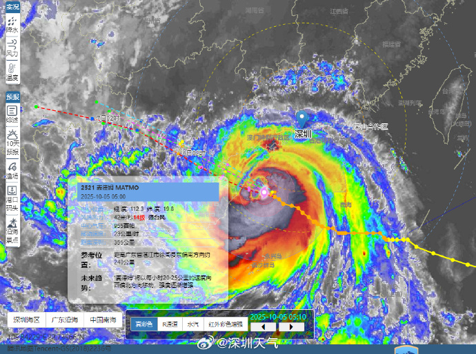 根据深圳天气消息,今年第21号台风“麦德姆”已加强为强台风级,5日05时中心位于深圳西南方355公里的南海海面上,中心风力14级(42米/秒),七级风圈半径340-400公里,东南和西南侧风圈半径有所增大。