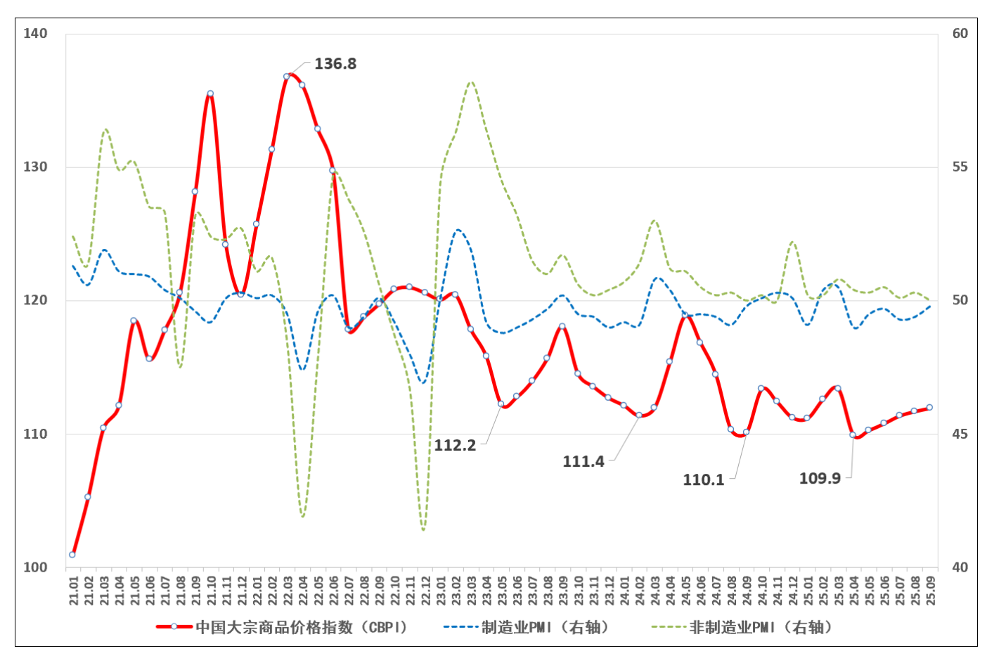 5日,由中物联大宗商品流通分会和上海钢联等单位联合调查,中国物流与采购联合会发布的2025年9月份中国大宗商品价格指数(CBPI)为111.9点,环比上涨0.2%,同比上涨1.7%。从指数运行情况看,连续五个月实现环比上升,表明企业预期乐观,生产经营保持扩张,大宗商品市场总体运行平稳。