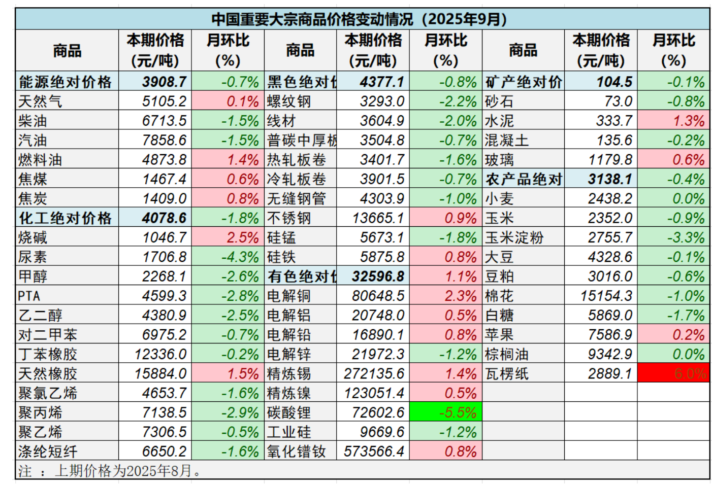 在中国物流与采购联合会重点监测的50种大宗商品中,9月价格环比上涨的大宗商品有18种。其中,瓦楞纸、烧碱和电解铜涨幅居前,较上月分别上涨6%、2.5%和2.3%;跌幅前三的为碳酸锂、尿素和玉米淀粉,月环比分别下跌5.5%、4.3%和3.3%。