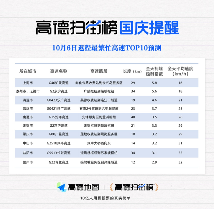 10月6日迎返程“双高峰”!最新预测:这10条高速最忙→