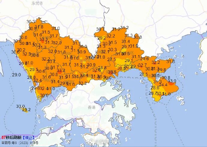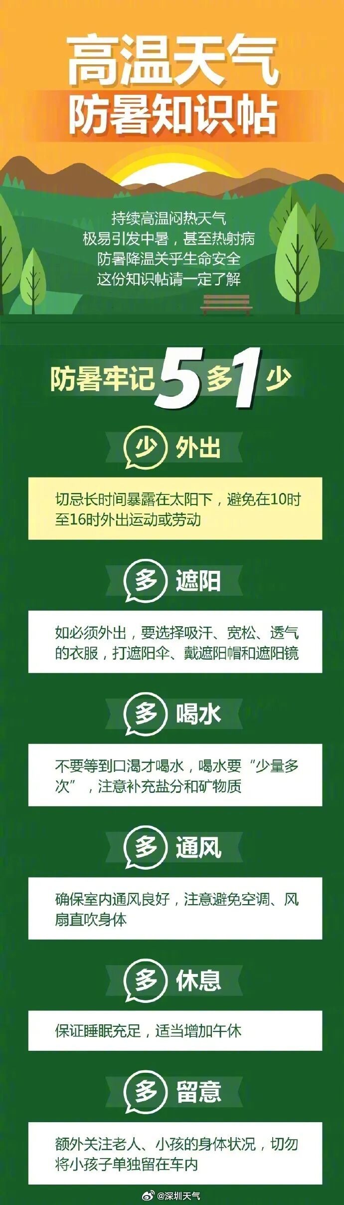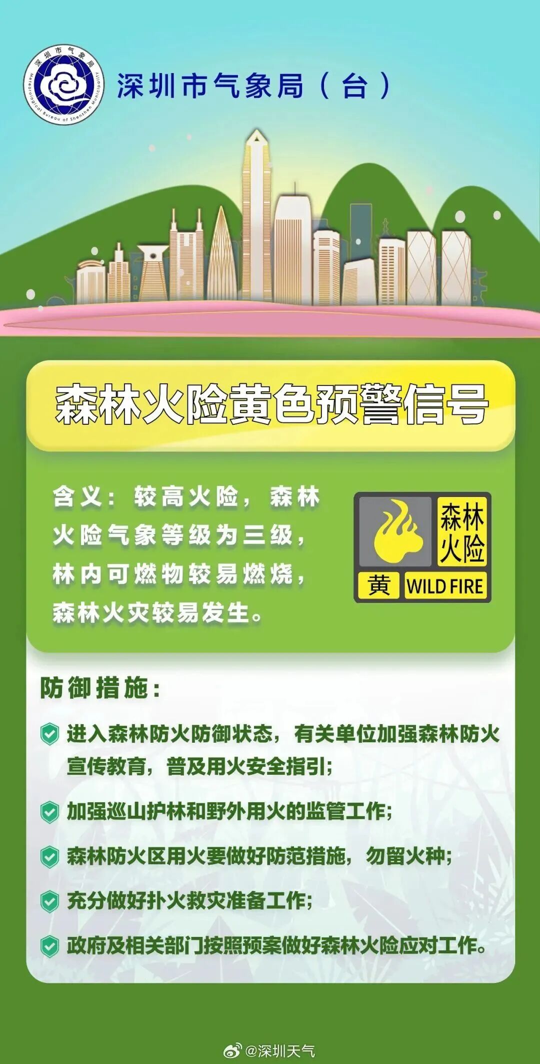 【深圳市高温黄色预警信号、森林火险黄色预警信号】深圳市气象台2025年10月07日10时00分发布全市高温黄色预警信号,同时联合深圳市森林防灭火指挥部发布全市陆地森林火险黄色预警信号,预计未来4-5天深圳市炎热干燥,中北部及人口密集区域最高气温将升至35℃以上。注意防暑降温,避免长时间户外活动。森林火险气象等级为三级,林内可燃物较易燃烧,森林火灾较易发生。有关主管部门加大巡山护林力度,严格管制野外火源。