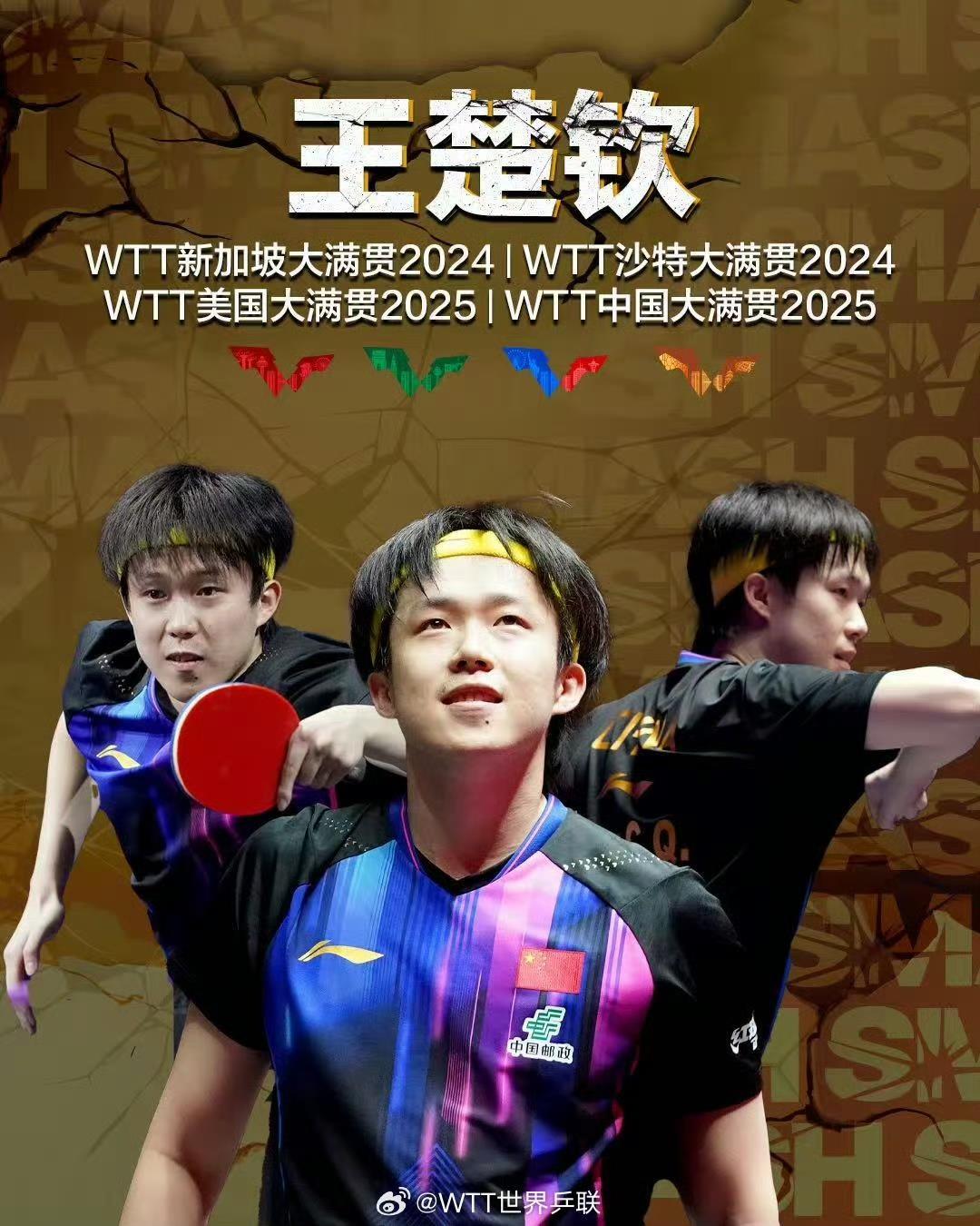 10月7日,国际乒联公布2025年第41周世界排名,王楚钦凭借在WTT中国大满贯中夺冠,世界排名积分从9425分跃升至10900分。至此,王楚钦又获一新成就,成为WTT大满贯赛事单打四冠王。