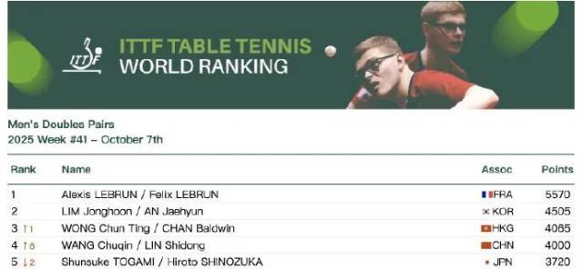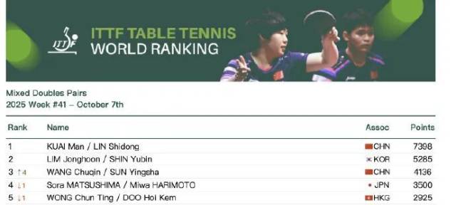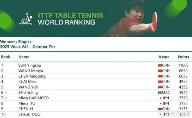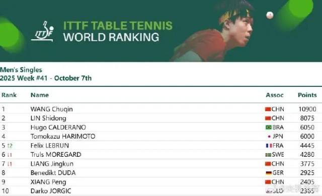 10月7日,国际乒联公布2025年第41周世界排名。