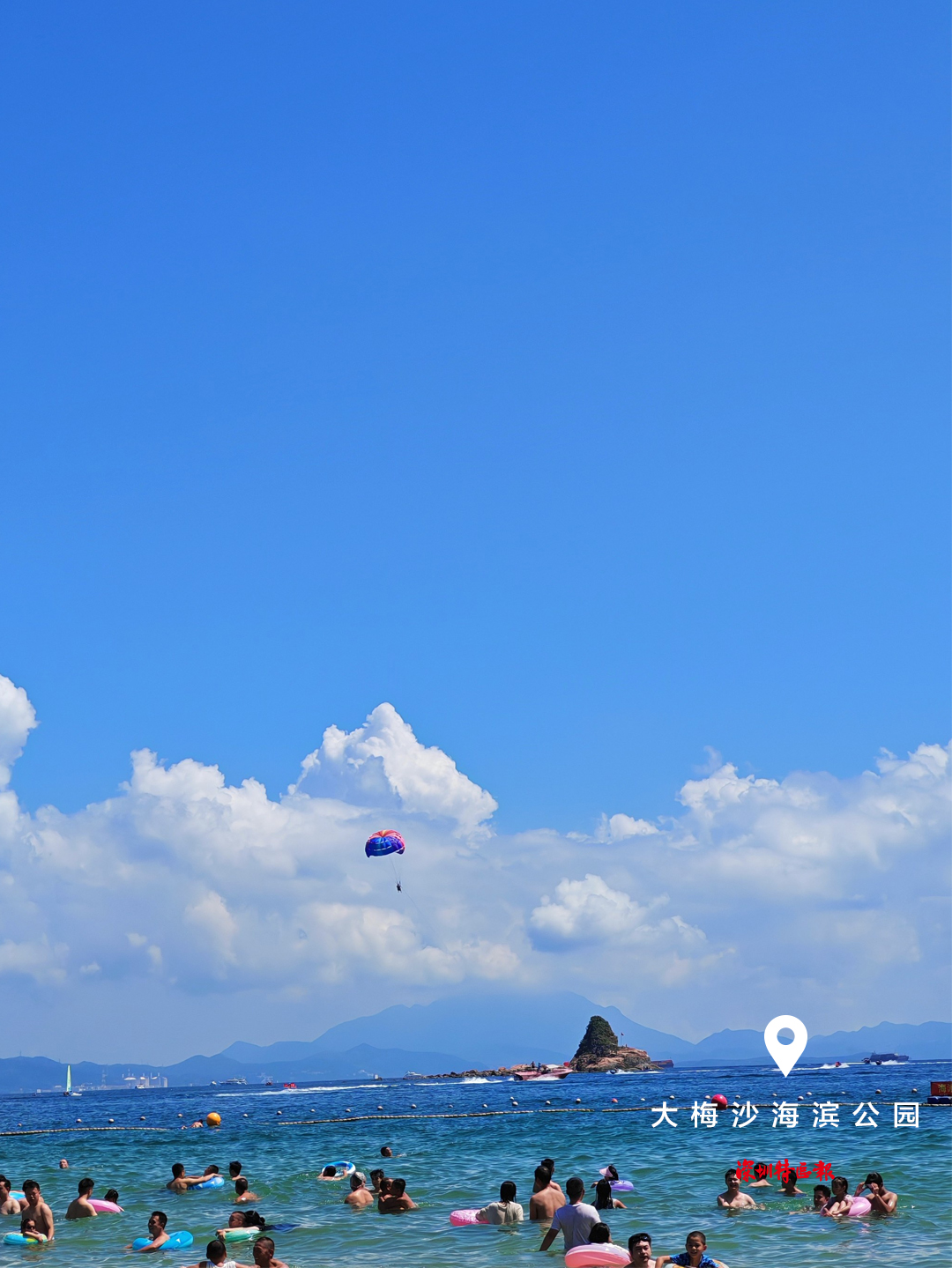 国庆假期期间,深圳大梅沙海滨公园迎来客流高峰。湛蓝天空广袤无垠,大朵大朵的白云如棉絮般自在飘浮,远处海天相接,海浪层层叠叠,轻拍岸边,游客在浪花中欢快嬉戏,尽享假期美好时光。