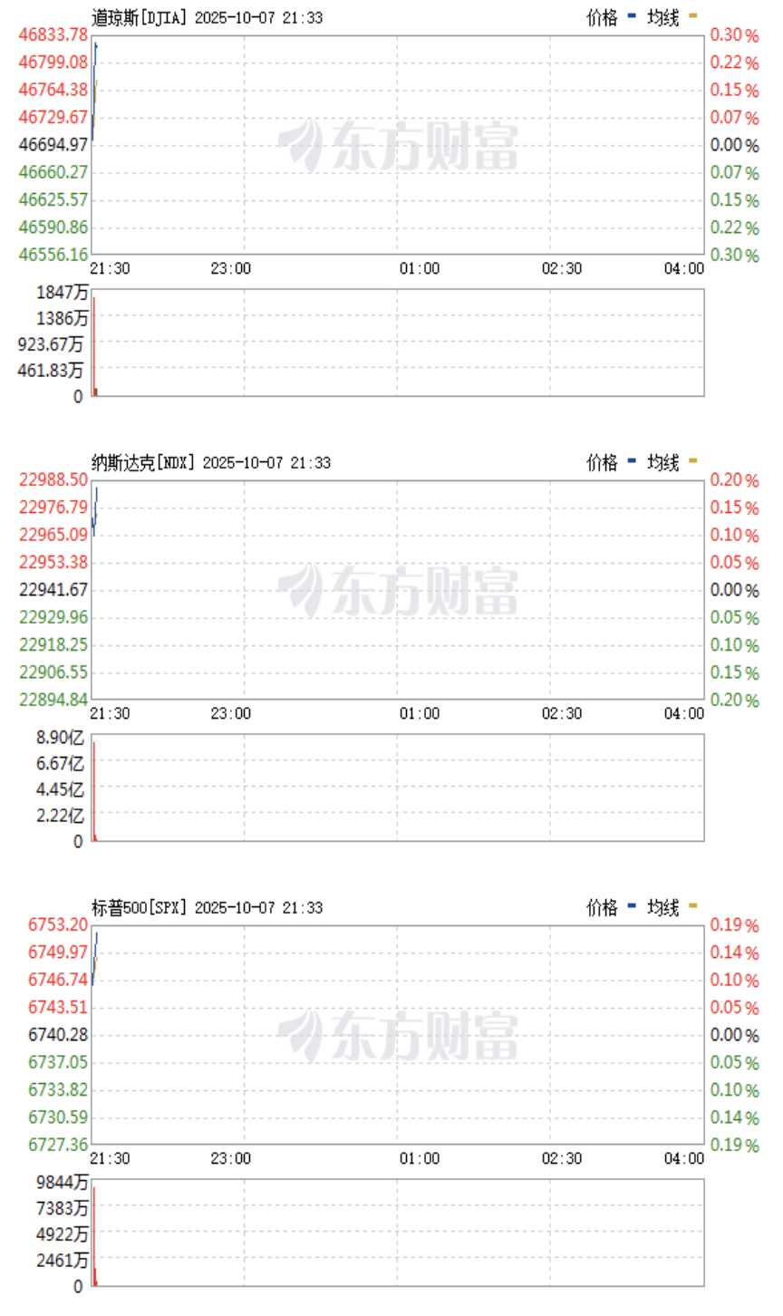 10月7日,美股三大指数小幅高开,道琼斯指数涨0.01%,标普500指数涨0.09%,纳斯达克综合指数涨0.07%。