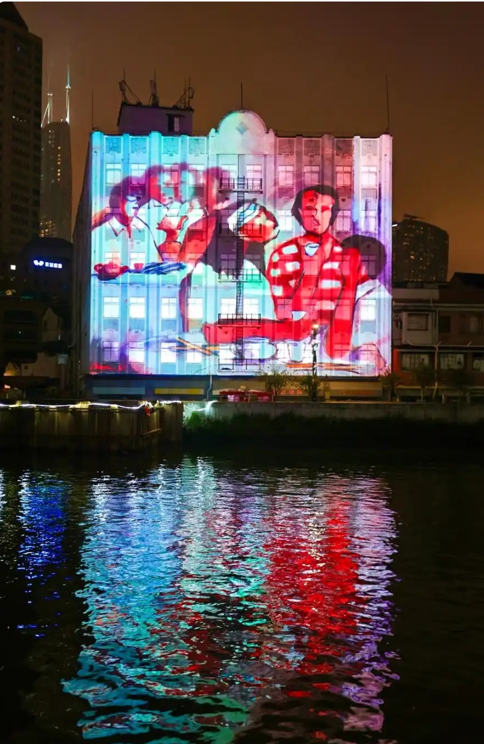 苏州河被誉为海派文化气质的集中体现,在这极具代表性的河岸,岭南画派的经典作品以光影形式“重生”,一幅幅色彩鲜活、生机盎然的水墨画卷倒映于温婉河水之上,形成奇妙而和谐的反差,既呈现海派的万千气象,也贯通了岭南画派“折衷中外、融汇古今”的精神内核。