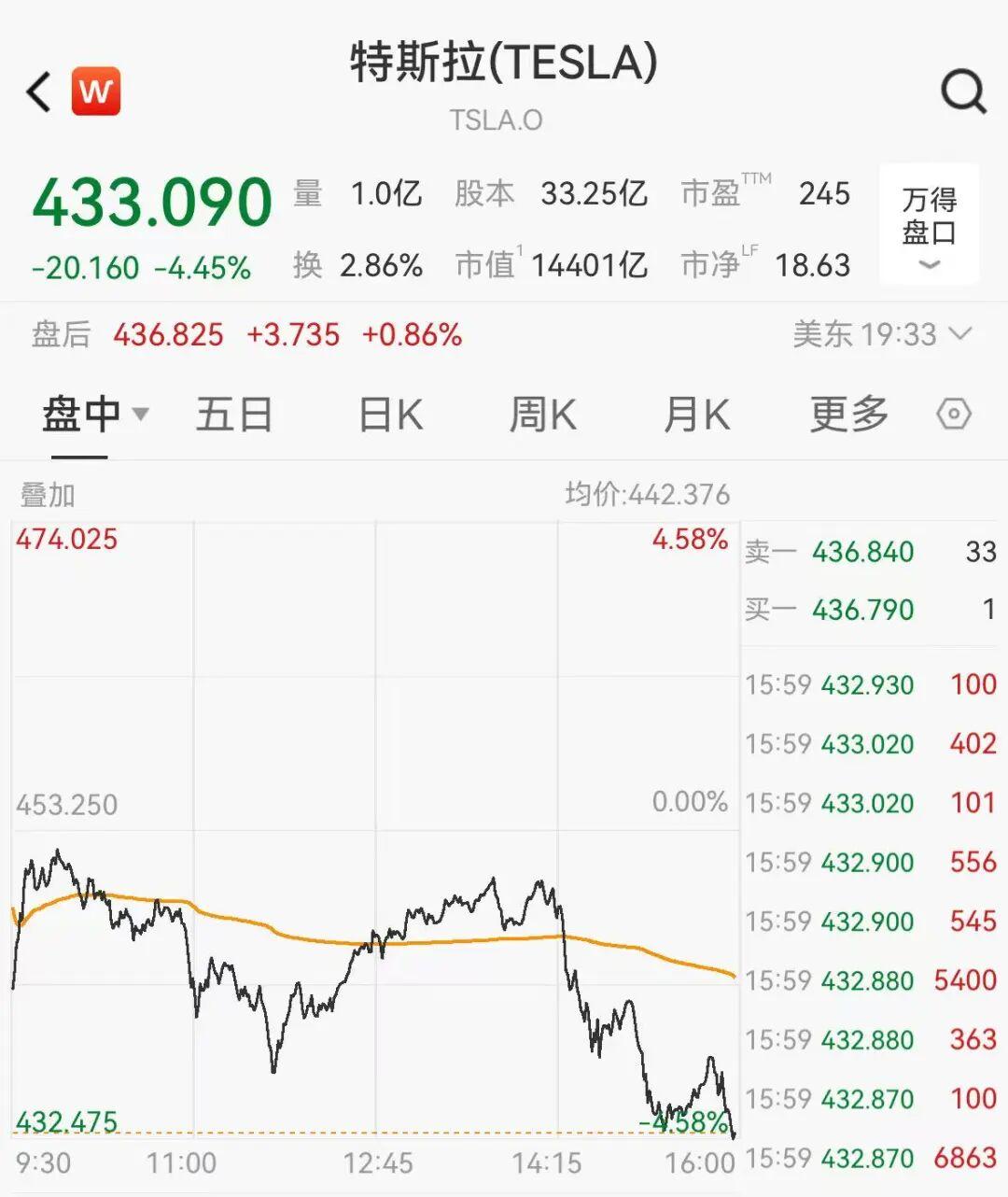 随着两款新车发布,特斯拉股价尾盘跳水,最终收跌4.45%,市值蒸发650亿美元(约合人民币4630亿元)。