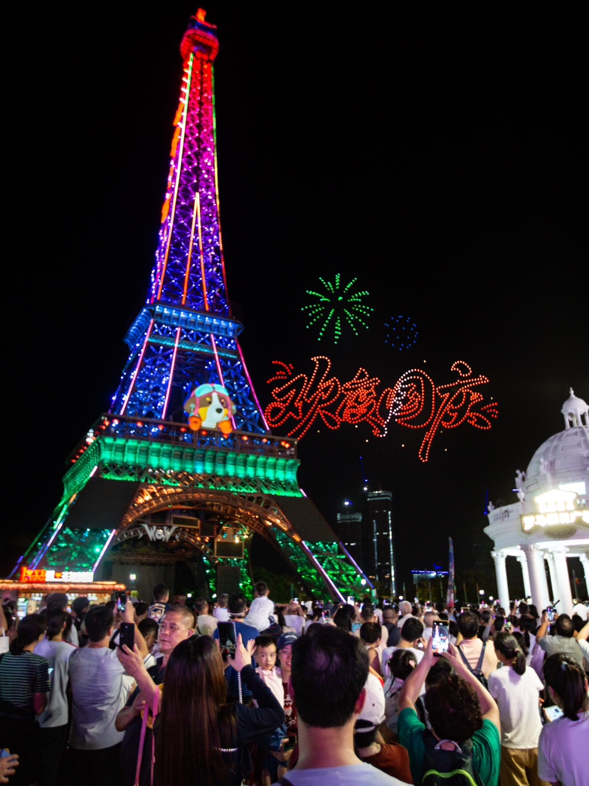 随着夜幕降临,欢乐持续升温。“全民街头卡拉OK”引发全场共鸣,场面温馨;“Darling迪斯科舞会”则在专业DJ的带动下,以经典旋律点燃夜晚激情。还有全新火秀《狂暴之火》以燃烧的火焰引爆全场气氛;《非遗双绝·天地焰》火壶打铁花表演以炽热的铁水点亮夜空。而作为国庆中秋双节限定节目,连续八晚亮相的千架无人机天幕大秀,通过科技与艺术的完美融合,在夜空中绘出节日祝福与动人图景,为游客的长假之旅留下了璀璨而难忘的收官回忆。
