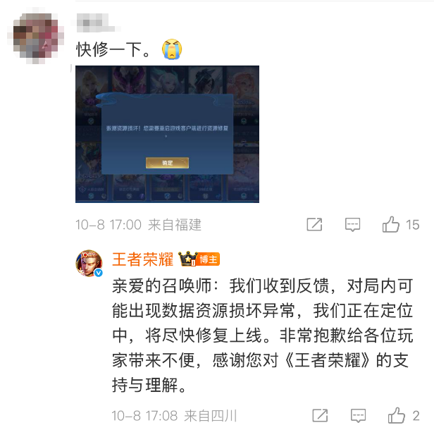 亲爱的召唤师:我们收到反馈,对局内可能出现数据资源损坏异常,我们正在定位中,将尽快修复上线。非常抱歉给各位玩家带来不便,感谢您对《王者荣耀》的支持与理解。