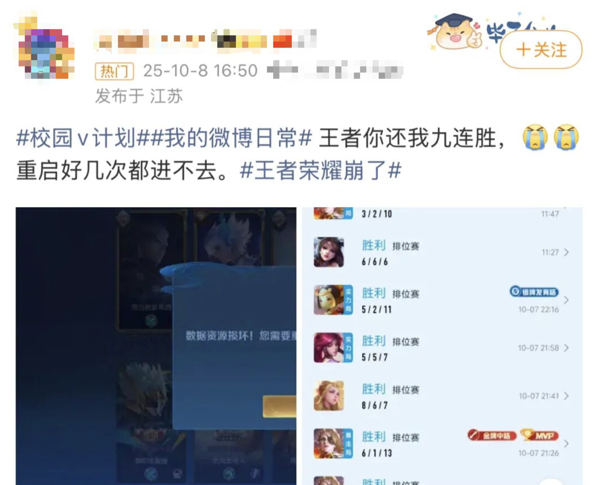 10月8日,不少网友称游戏《王者荣耀》出现提示“数据资源损坏!您需要重启游戏客户端进行资源修复”以及带来玩家信誉分被扣等问题。