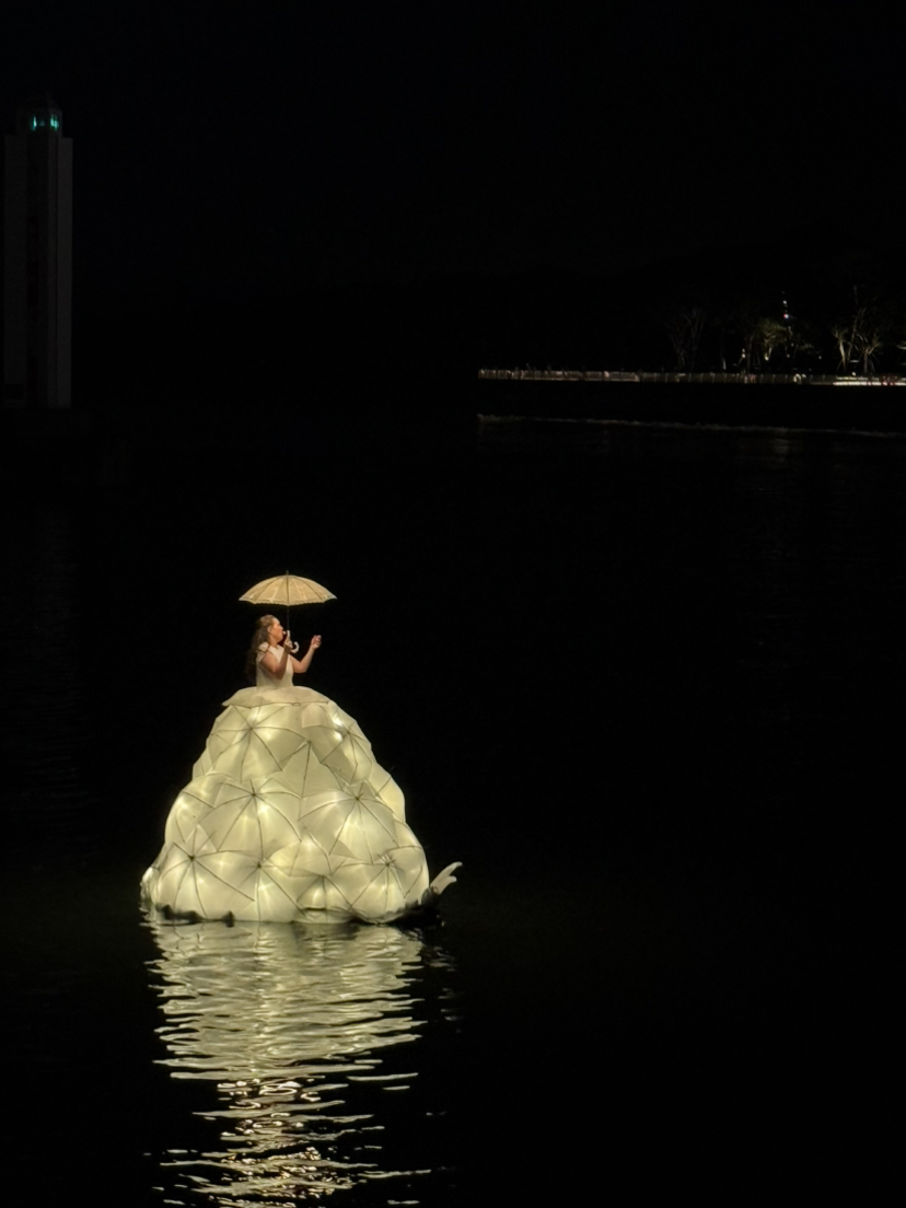 每场演出持续20分钟。演出中,来自荷兰的女歌唱家维克托琳·帕斯曼身着巨大伞状礼服,手持小洋伞,漂浮于海面,引吭高歌。