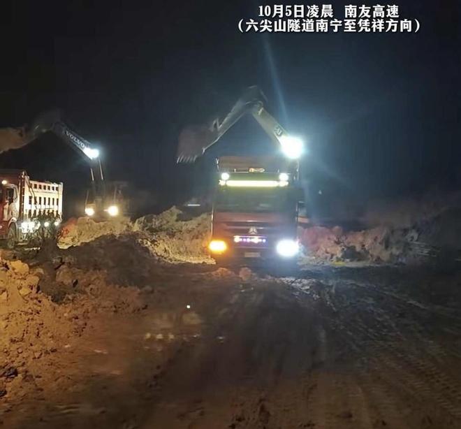 此前,受连日持续强降雨影响,10月4日21时41分,凭祥市南友高速(六尖山隧道凭祥至南宁方向)发生山体滑坡,致双向车道阻断。该次山体滑坡土方量约5000立方米,滑坡总面积约1000平方米,大范围的滑坡造成六尖山隧道双向车道阻断。险情发生后,凭祥市相关部门迅速启动应急处置工作,彻夜开展抢险救援。8日上午恢复通行,直至16时再次发生山体滑坡。
