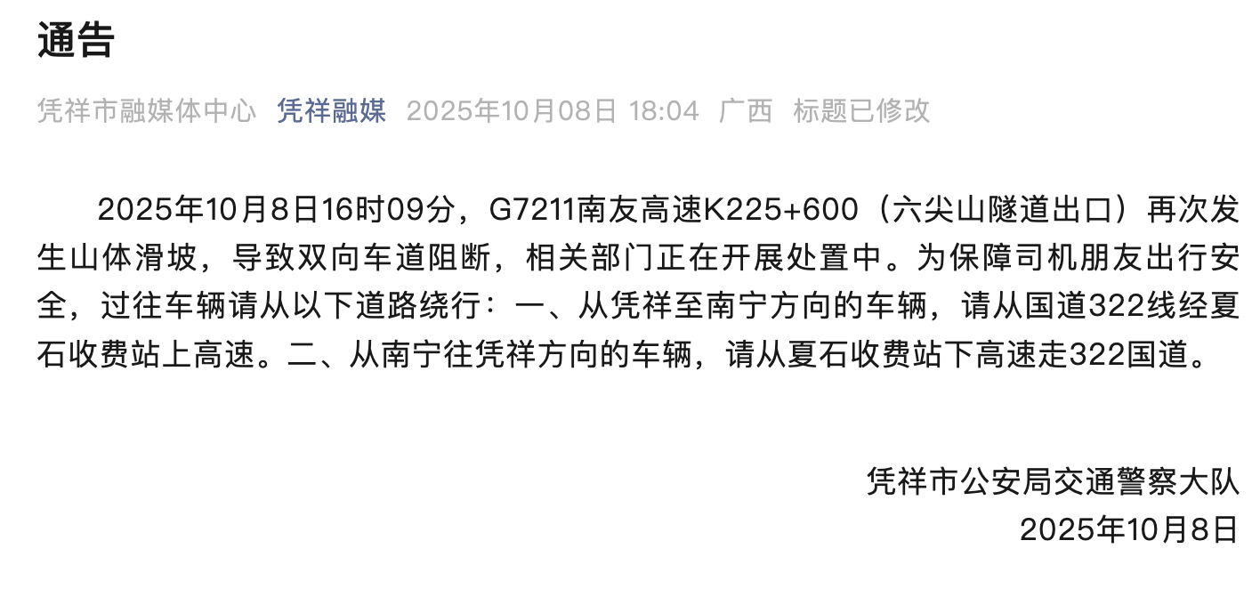 10月8日下午,广西崇左凭祥市公安局交通警察大队发布通告:10月8日16时09分,G7211南友高速K225+600(六尖山隧道出口)再次发生山体滑坡,导致双向车道阻断,相关部门正在开展处置中。为保障司机朋友出行安全,过往车辆请从以下道路绕行:一、从凭祥至南宁方向的车辆,请从国道322线经夏石收费站上高速。二、从南宁往凭祥方向的车辆,请从夏石收费站下高速走322国道。