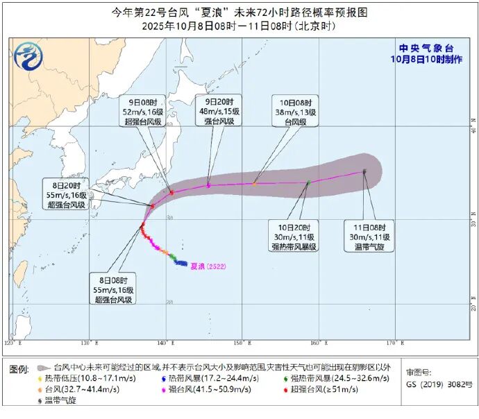 另据中央气象台昨天(8日)10时消息:今年第22号台风“夏浪”(超强台风级)的中心8日上午8点钟位于日本九州岛东偏南方向约690公里的西北太平洋洋面上。预计,“夏浪”将以每小时20-25公里的速度向北偏东方向移动,强度变化不大,9日白天逐渐转向偏东方向移动,尔后强度逐渐减弱。