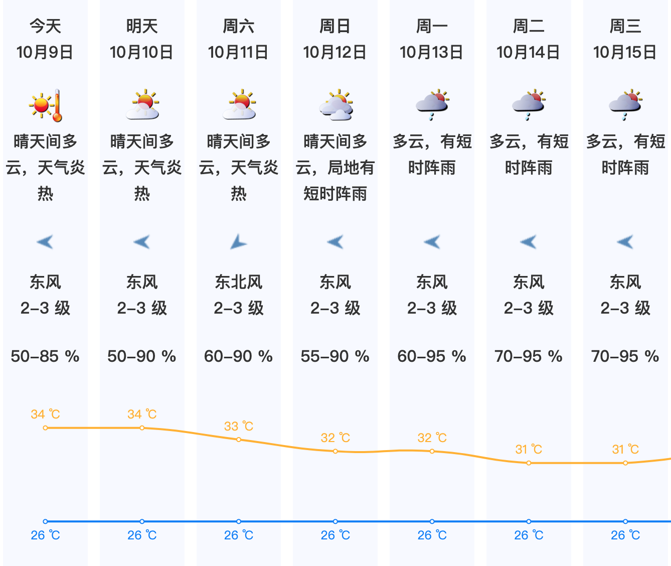 9-11日晴天间多云,天气炎热,局地有短时阵雨,其中9日气温26-34℃,中北部和人口密集区最高气温可达35-36℃。
