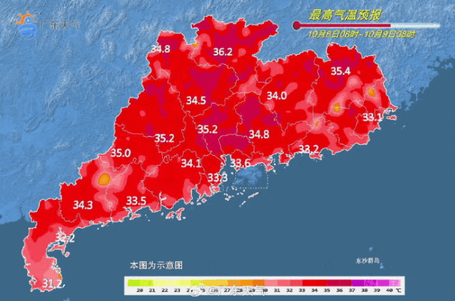 预计9-11日,受副热带高压控制,炎热依旧是广东的主旋律,全省晴到多云为主,粤西受偏东气流影响,多云间阴天有分散小雨。最高气温:粤西31~33℃,其余市县33~36℃,局部37℃。