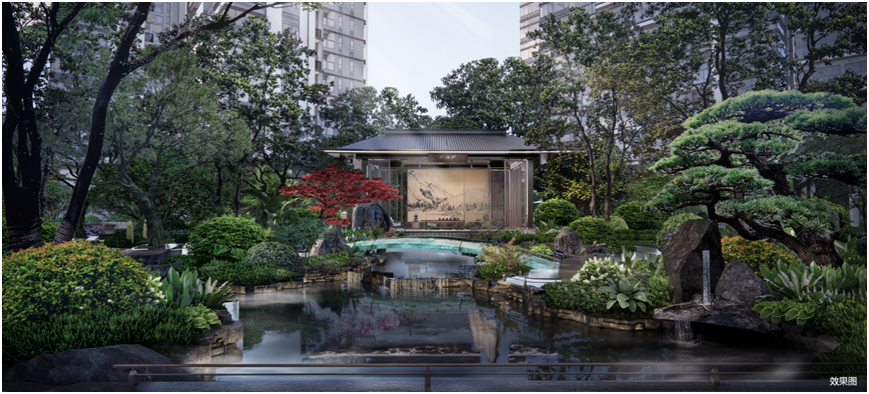 鹏宸云筑西区园林溯源岭南四大名园之首的清晖园,承袭其“前庭后院”规制,以“一轴一心一环”骨架打造“山水六境”园林。入口处的琉璃影壁、中心区域的叠水飞虹、折桂轩内的《富春山居图》艺术玻璃、小飞虹琉璃桥等细节,均以现代手法转译岭南匠艺。水榭、拱桥、奇石等经典元素融入全龄空间,使园林成为可游可赏的文化藏品,让居者日常浸润于风雅意境之中。