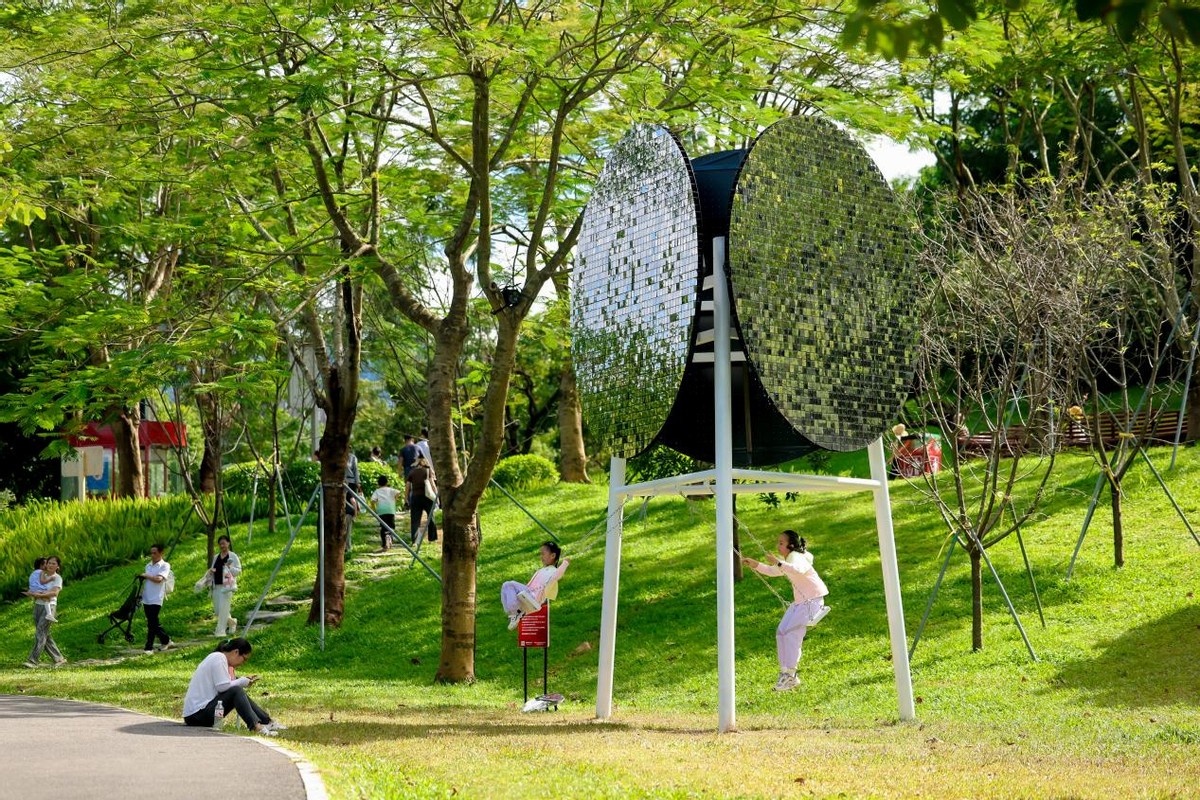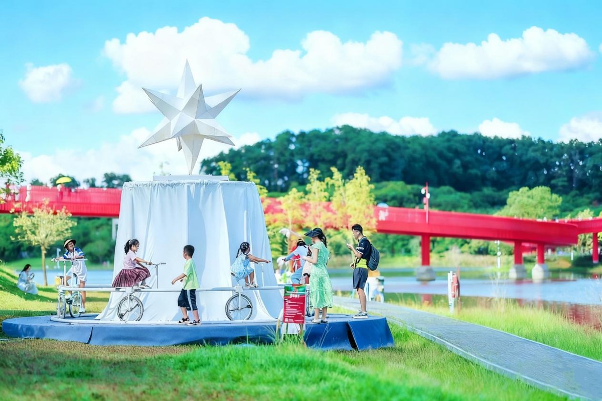 碧湖区的三大湖畔情绪装置,成为连接游客与自然、艺术的“情感纽带”。《听云起的声音》以随风舞动的泡泡唤醒童真,孩子们追逐着漫天泡泡,笑声回荡在湖畔;《骑到星星升起》设计巧妙,游客踩动单车踏板,装置便会同步点亮星光,大人小孩争相体验,感受“亲手点亮浪漫”的乐趣;《坠入月光之梦》则将秋千与光影结合,游客荡起秋千时,仿佛“坠入诗意月光”。这些装置不仅是公园中的“情绪开关”,更让游客在互动中与自然、艺术产生深度联结。