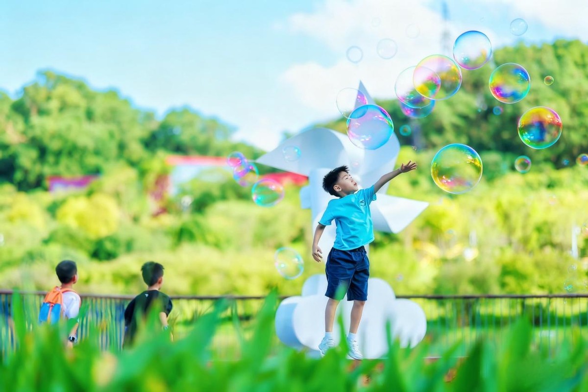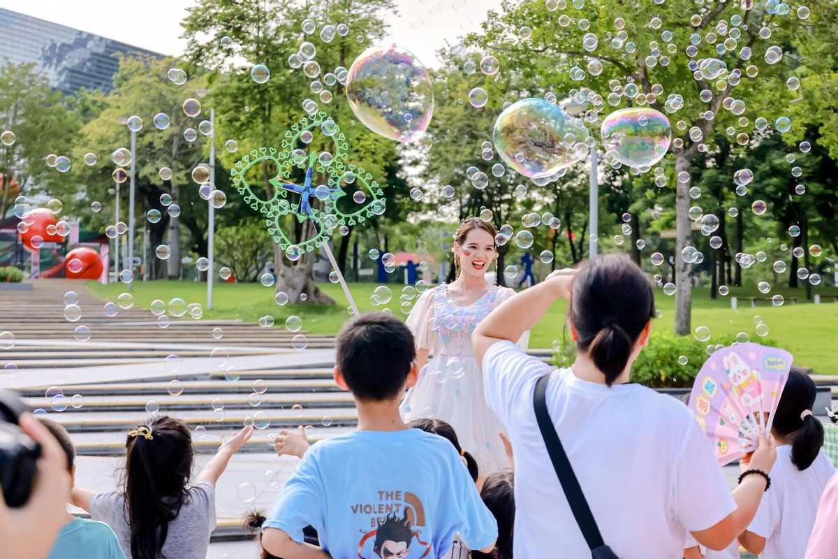 白天的虹桥公园充满亲子温情与活力气息。北广场的“童屿奇踪·亲子泡泡秀”每日三场准时登场,七彩泡泡随风轻扬,孩子们追逐嬉戏,家长们举着相机记录,成为亲子家庭的必打卡项目。
