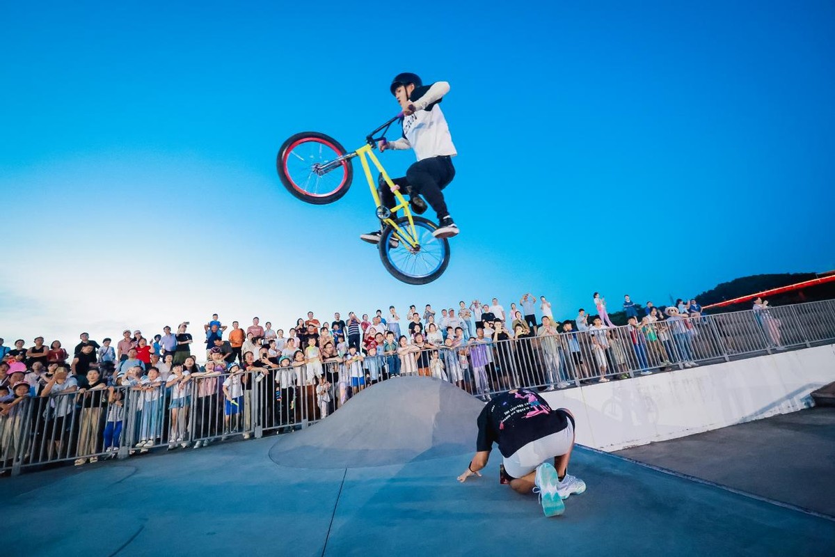 10月4日至6日,活动三大定点演出重磅上线,为市民带来更具冲击力的视听体验。碧湖区滑板场的“跃动纪元·极限秀场”堪称“热血担当”,极限运动员们轮番展示BMX小轮车、滑板与极限轮滑的高难度动作:BMX选手在碗池与跳台间腾跃,完成360度空中转体、后轮定车;滑板选手脚踩板面掠过栏杆,杆上滑行、空中抓板行云流水;极限轮滑以高速过弯、飞跃抛台的爆发力震撼全场,每一个精准落地的动作都引发观众连连惊呼。