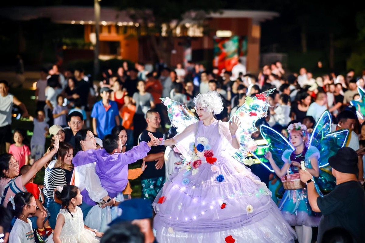 南广场“虹动拾光・跷影舞聚”则通过荧光服饰舞者、高跷NPC与冷焰火效果,在夜色中编织出一场梦幻夜光派对,市民游客与“虹光精灵”互动合影,笑声与歌声回荡夜空。