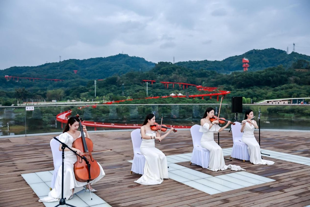 篮球场上,花式足球、花式篮球表演的每一次高难度技巧展示都引来观众阵阵喝彩。日熹阁天台则是另一番雅致景象,艺术体操表演中,演员手持彩带如蝴蝶起舞,与背后的湖光桥影相映成趣;弦乐四重奏的优雅旋律缓缓流淌,让人们在自然景致中感受艺术之美。夜幕降临后,嘉年华氛围切换至“浪漫狂欢模式”。南广场的“声波虹动·乐队燃歌”接棒登场,熟悉的旋律引发全场大合唱,将节日氛围一次次推向高潮。