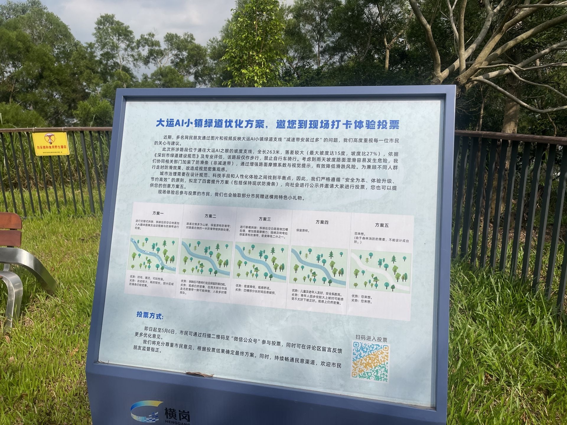 日前,记者再次走访大运AI小镇绿道,此前引争议的防滑条确实存在。记者现场看到,在该绿道起点处设有“大运AI小镇绿道优化方案,邀您到现场打卡体验投票”的公示栏。