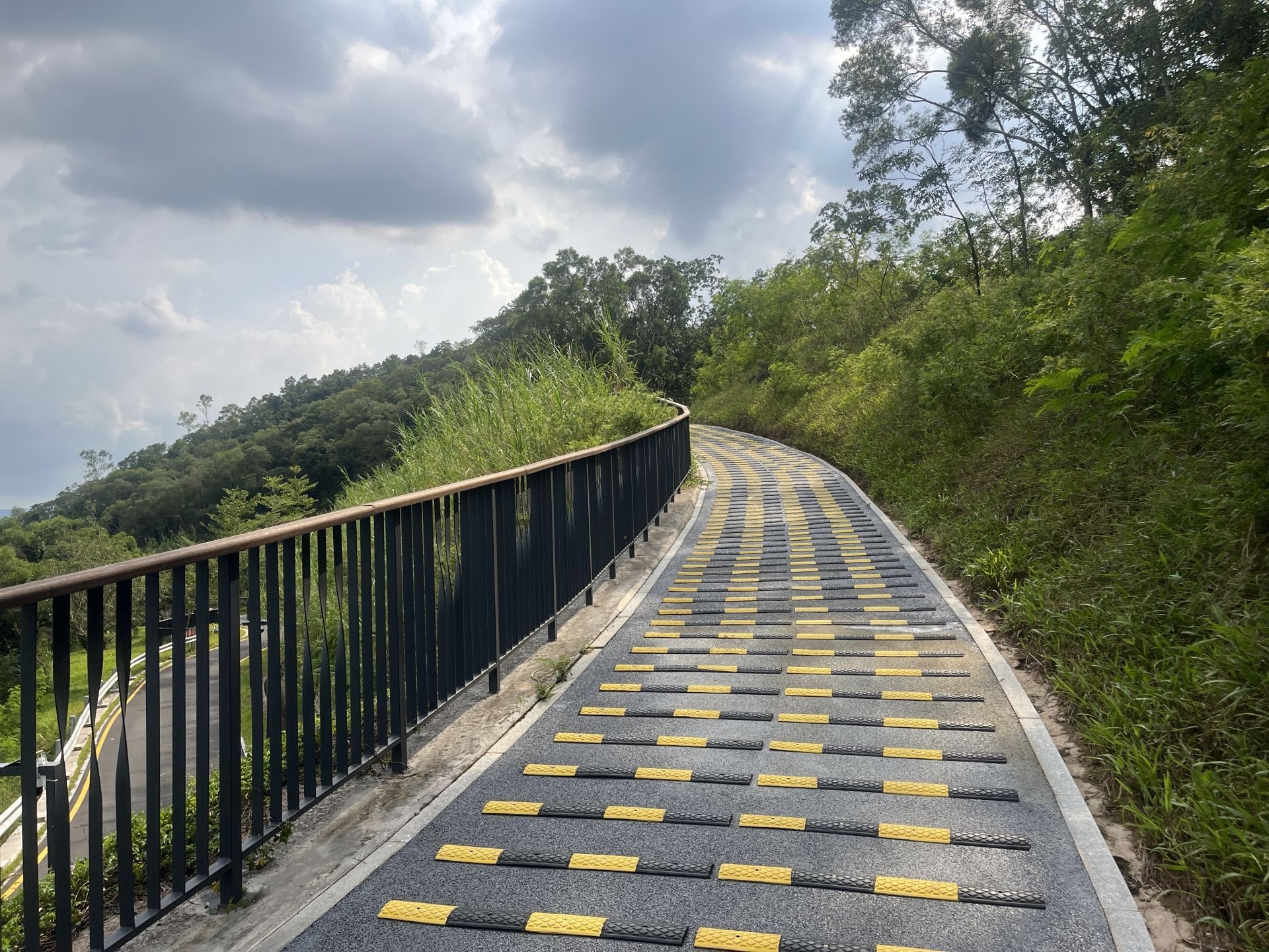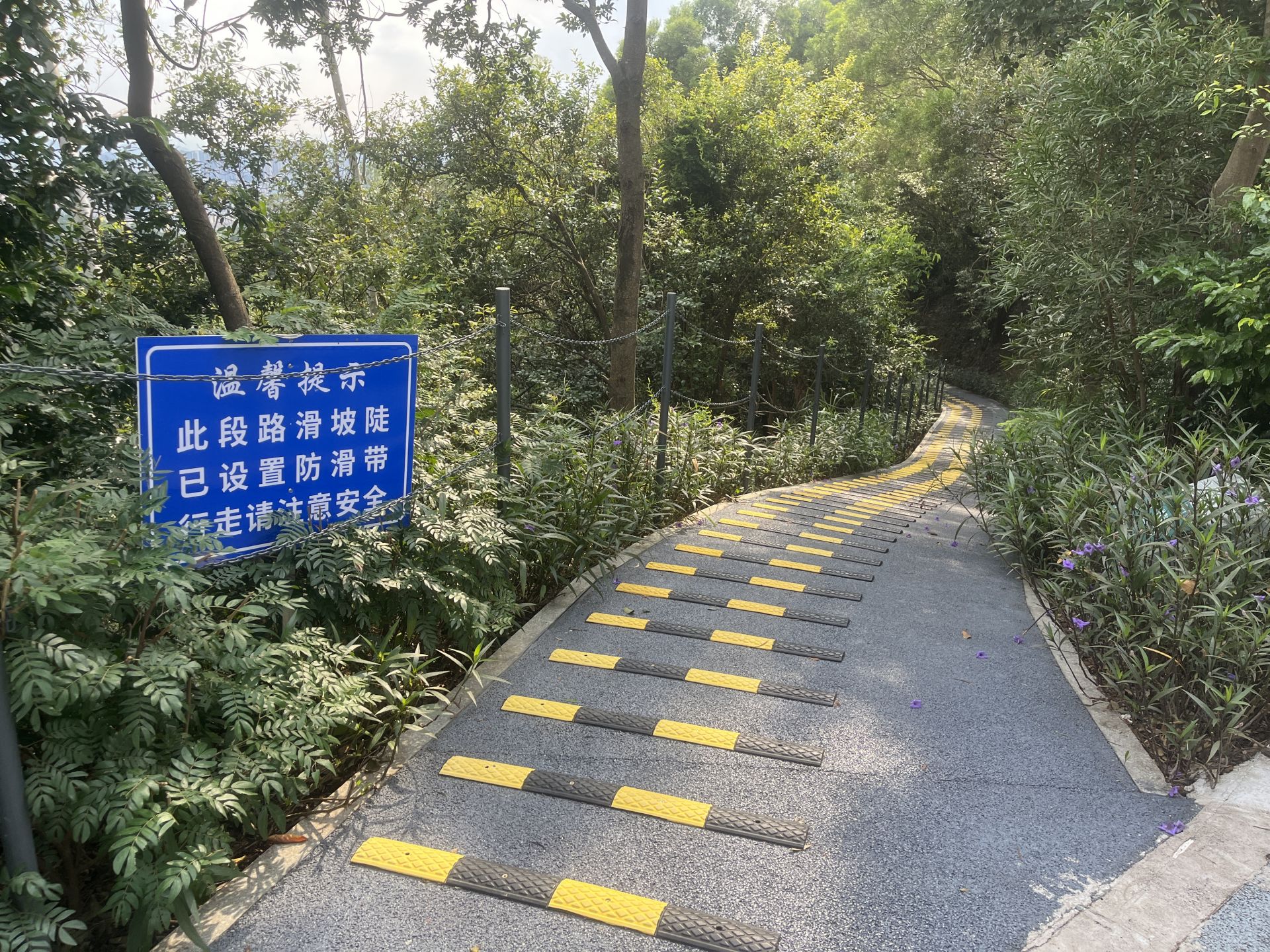 龙岗区横岗街道办事处也曾回应读特新闻记者称,该路段并非网上所称的骑行绿道,而是步行绿道。经实测,该路段最大坡度远超深圳自行车道建设标准。基于此,为充分保障行人的出行安全,此路段最终按照步行道标准进行建设。同时,针对雨天湿滑隐患,经专业评估加装了防滑条(非传统减速带),通过增强路面摩擦系数与视觉提示,降低滑跌风险。