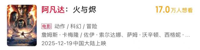 目前,《阿凡达:火与烬》在猫眼APP上的想看人数已达到17万。